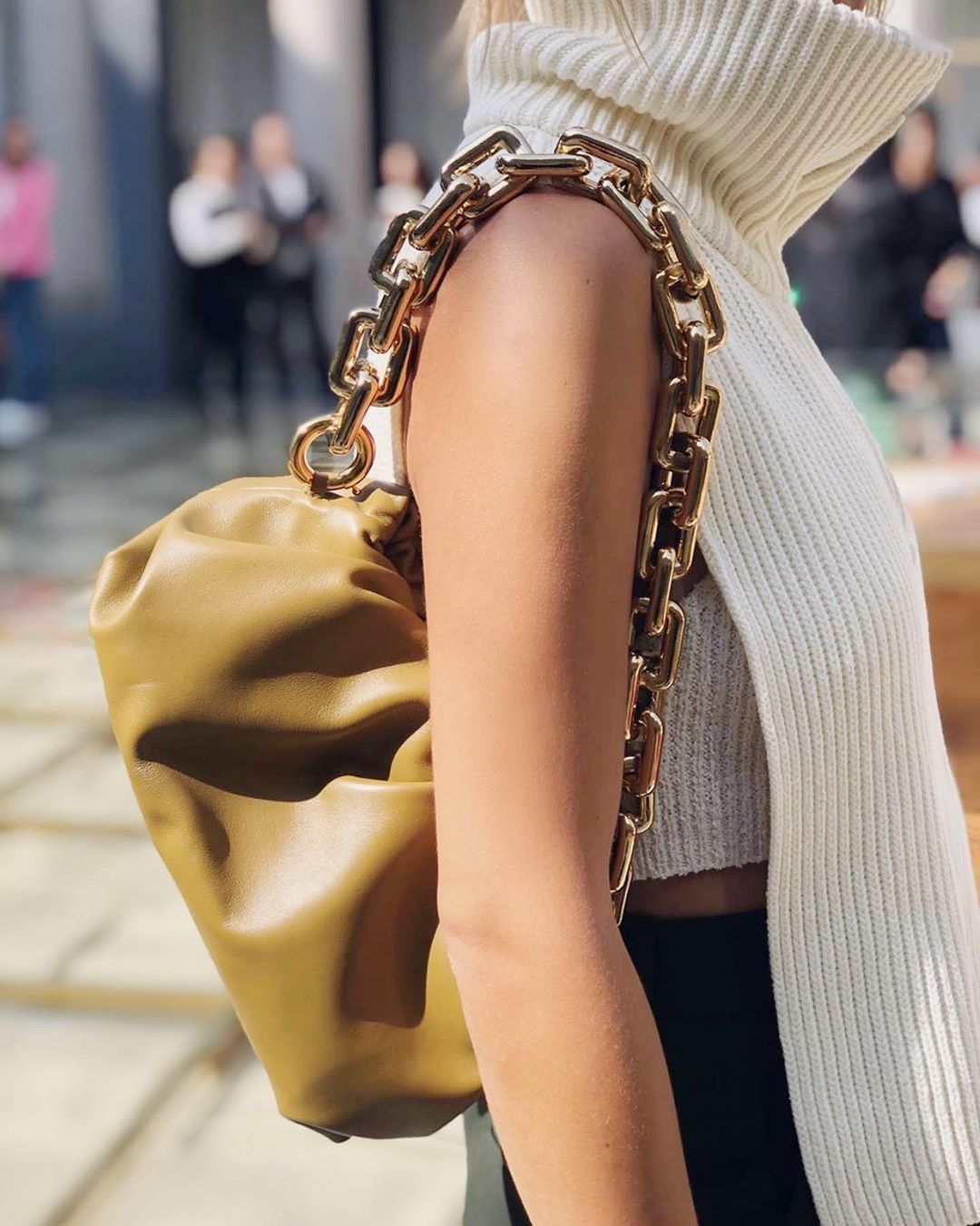 Pentru acest an, casa de modă italiană a decis să creeze o nouă versiune a piesei sale obligatorii – The Pouch Bag, chiar înainte de începerea sezonului de primăvară/vară 2020. Geanta, proiectată de Daniel Lee, are aceeași formă și a fost creată din piele neagră de calitate, dar de data aceasta vine cu un lanț aur voluminos, în loc de o curea de umăr.