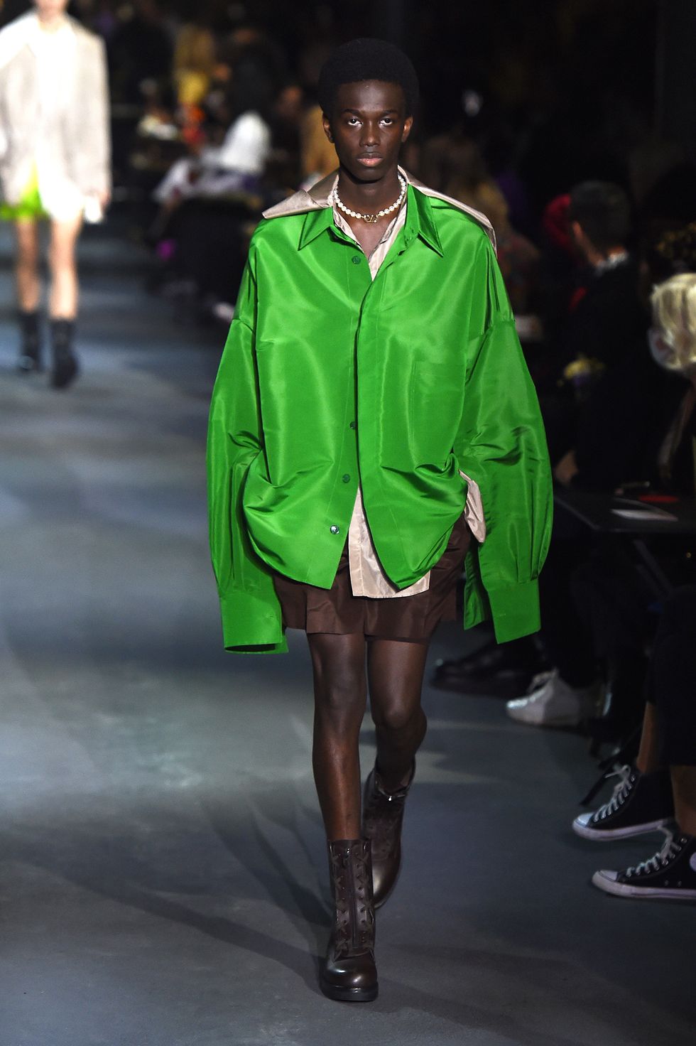 Vara asta se poartă cămăși în nuanțe îndrăznețe, pe care le-am văzut inițial la Valentino în Kelly Green. Sunt la modă nuanțe de chartreuse, mandarine și violet intens.