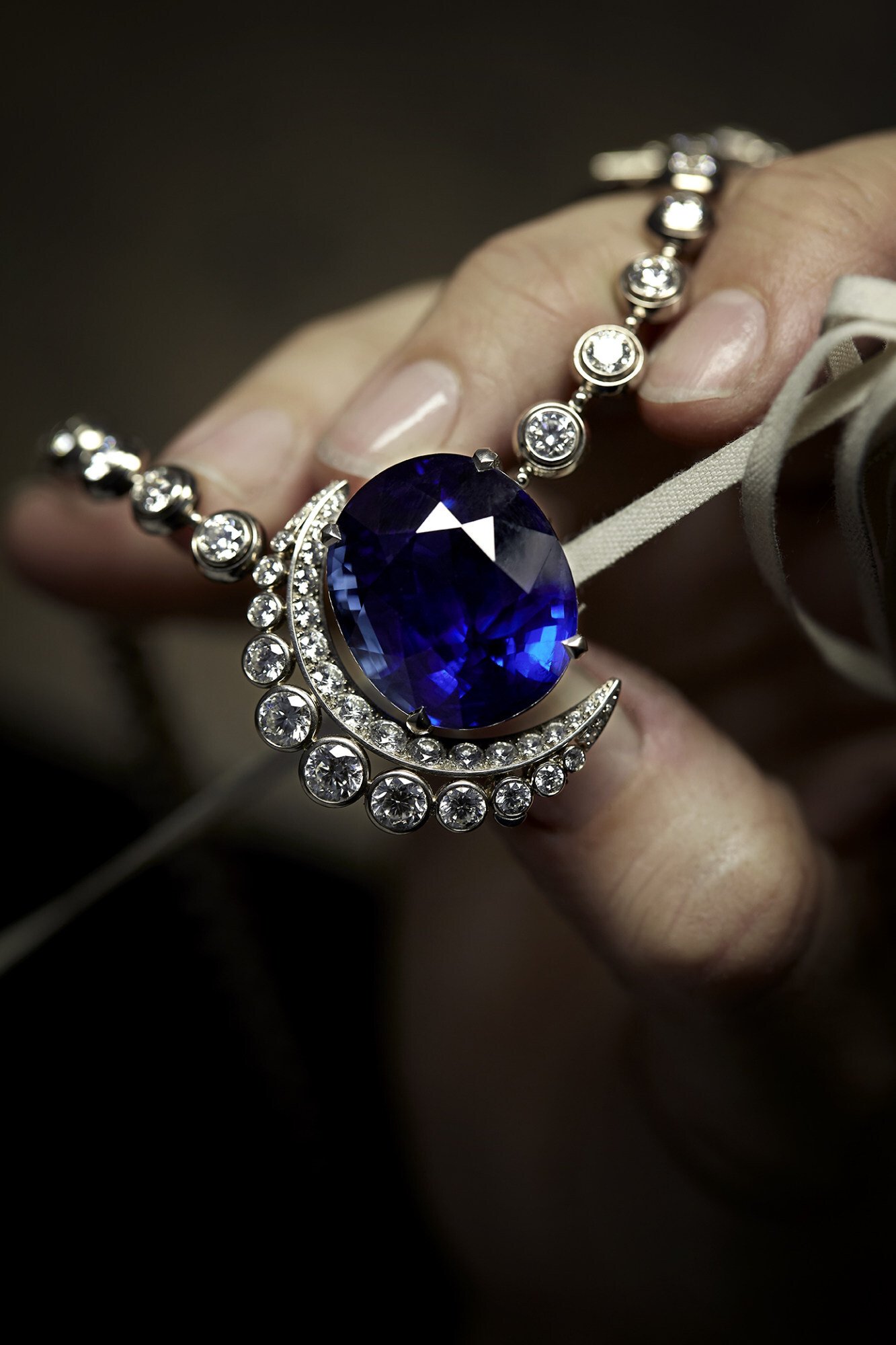 Colierul combină curbele clasice cu linii drepte contrastante. În mijlocul tuturor se află un safir oval albastru cântărind 55,55 carate. Colierul este atractiv din multe puncte de vedere, nu doar prin designul sau unic sau materialul opulent, ci și pentru că piesa este, de asemenea, complet transformabilă. Halourile pot fi detașate pentru a fi folosite ca broșe. Rândul central de diamante poate fi scos și purtat ca brățară. Acest lucru lasă un colier nou delicat, cu o lungime mai scurtă și mai ușor de purtat.