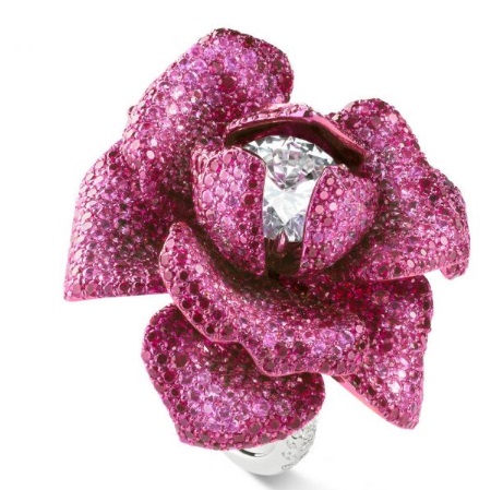 Un alt exemplu excelent de măiestrie și originalitate la superlativ este inelul în formă de trandafir. Petalele sale sunt sculptate cu tenacitate din titan și aluminiu acoperite cu safire roz. Ascuns în interior se află un diamant prețios de două carate în inima florii, care și-a captivat veșnic privitorul ca în cinema.