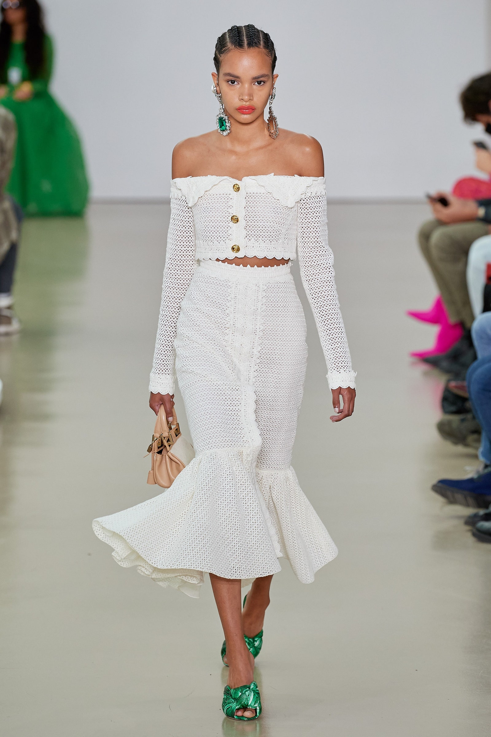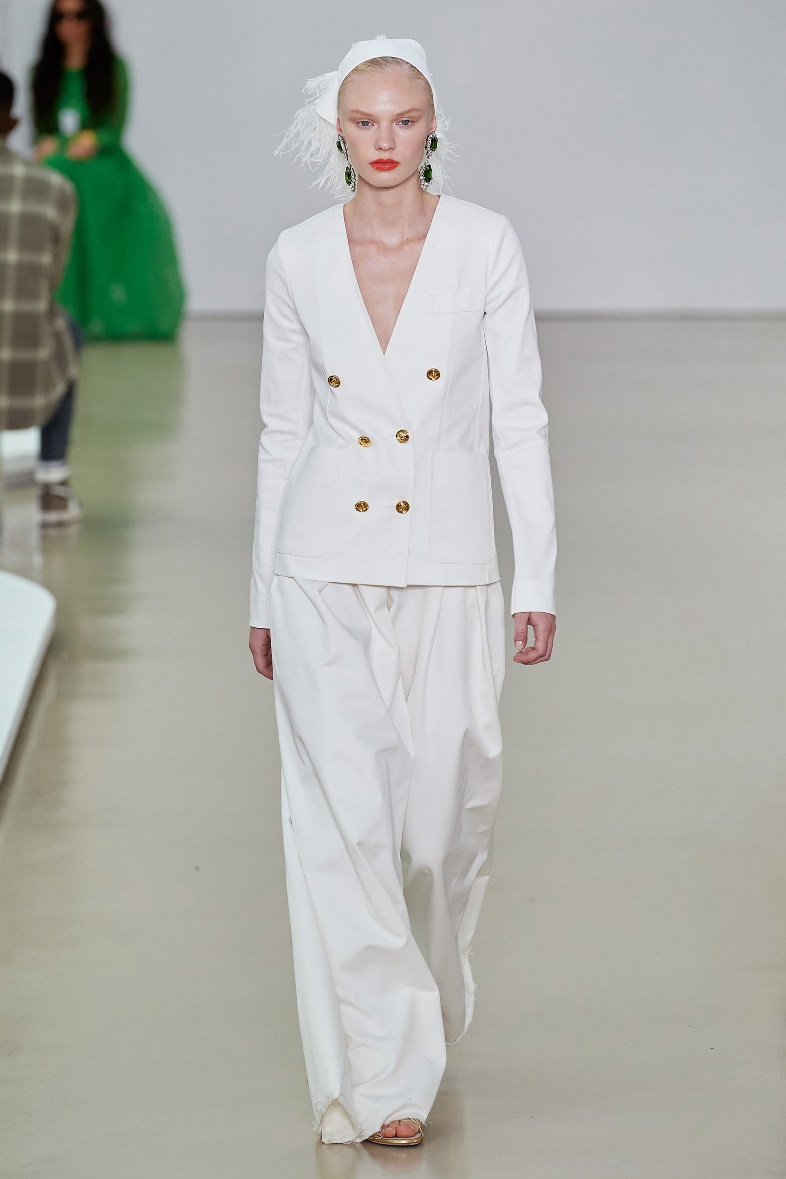 Fie că suntem în anii 70 sau în secolul 21, costumul alb cu pantaloni palazzo este încă un hit. Giambattista susține, de asemenea, eliminarea reverului la decolteu pentru a conferi ținutei o estetică mai minimalistă, care poate fi la fel de sofisticată ca și aspectul tradițional.
