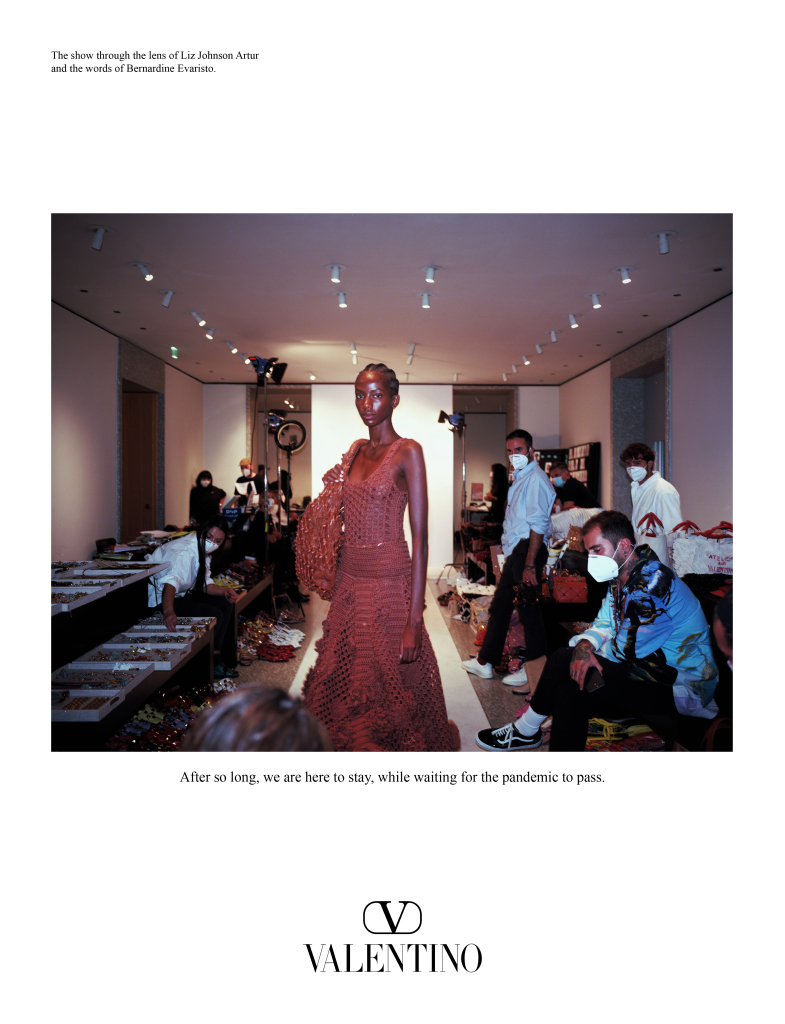 Exemplificând aceste concepte, Piccioli i-a cerut lui Liz Johnson Artur, câștigătoarea Premiului Turner, să fotografieze colecția Valentino primăvara 2021 din Milano, în cadrul prezentării de modă organizată în septembrie, reflectând asupra distanțării sociale și realității pandemiei - măști chirurgicale incluse - cu un citat de la câștigătoarea Premiului Booker, Bernardine Evaristo.