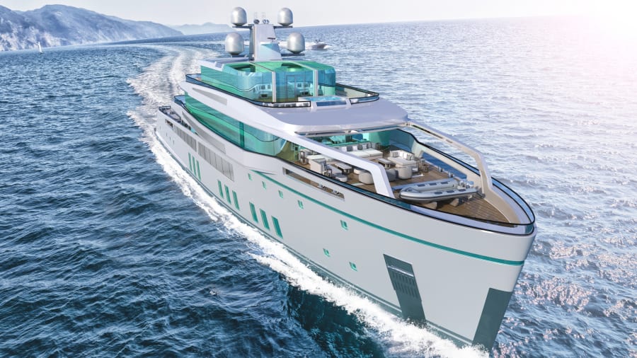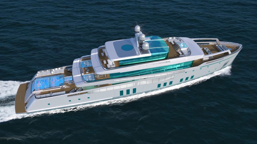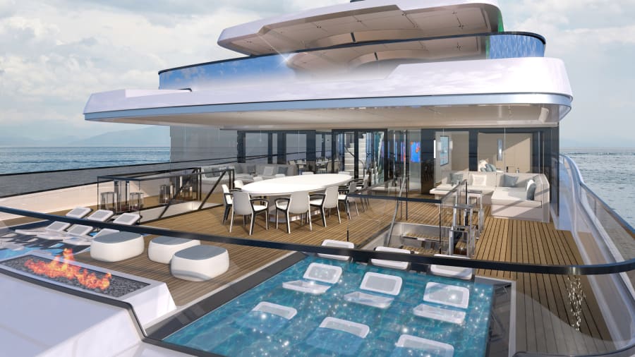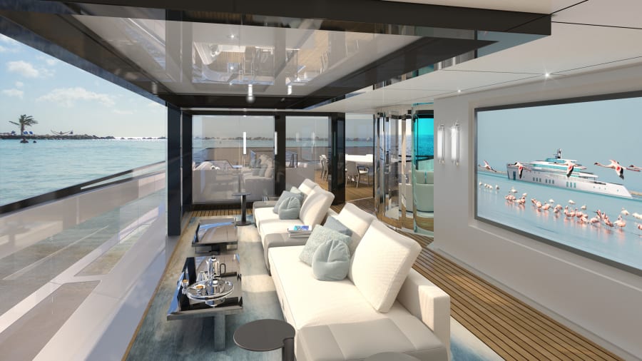 Conceptul SEE de 65 de metri nu numai că deține un exterior unic alcătuit din pereți uriași de sticlă reflectorizantă, dar are și cinci piscine, inclusiv o piscină infinită cu fund de sticlă, precum și un cinematograf în aer liber la bord.