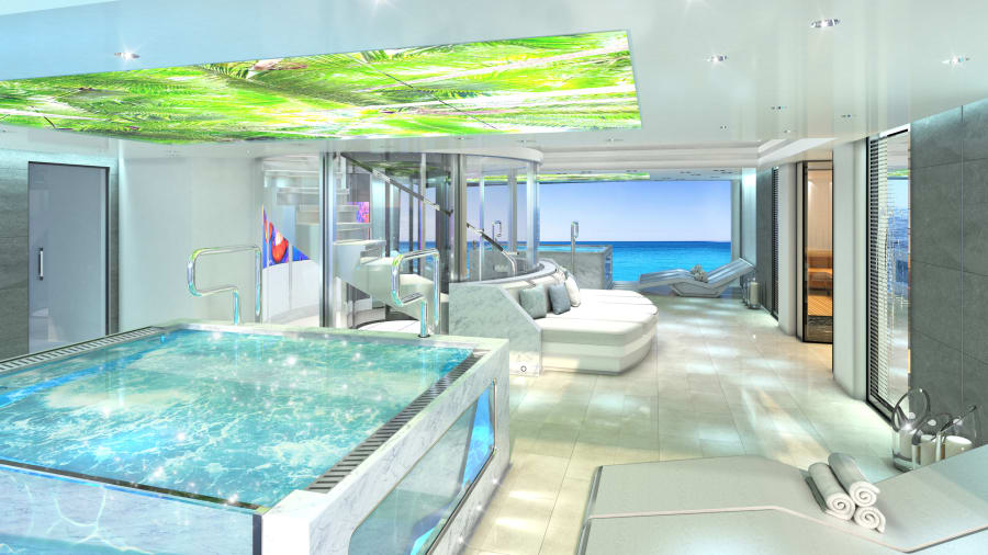Lounge-ul său de pe punte, poziționat sub piscina infinită, are un cinematograf 3D în aer liber cu un element mare de sticlă retractabilă care transformă zona într-o terasă mare atunci când este retrasă.