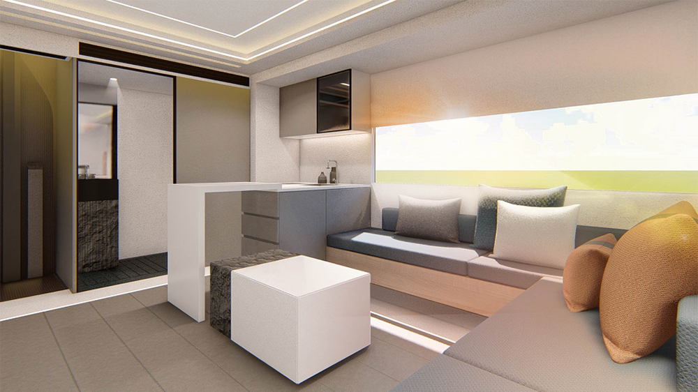 Zona principală de dormit este situată în spațiul de deasupra cabinei șoferului. Alte caracteristici includ iluminarea LED personalizabilă, un sistem de sunet JBL, conexiuni pentru un televizor sau proiector, o mașină de spălat și aer condiționat.