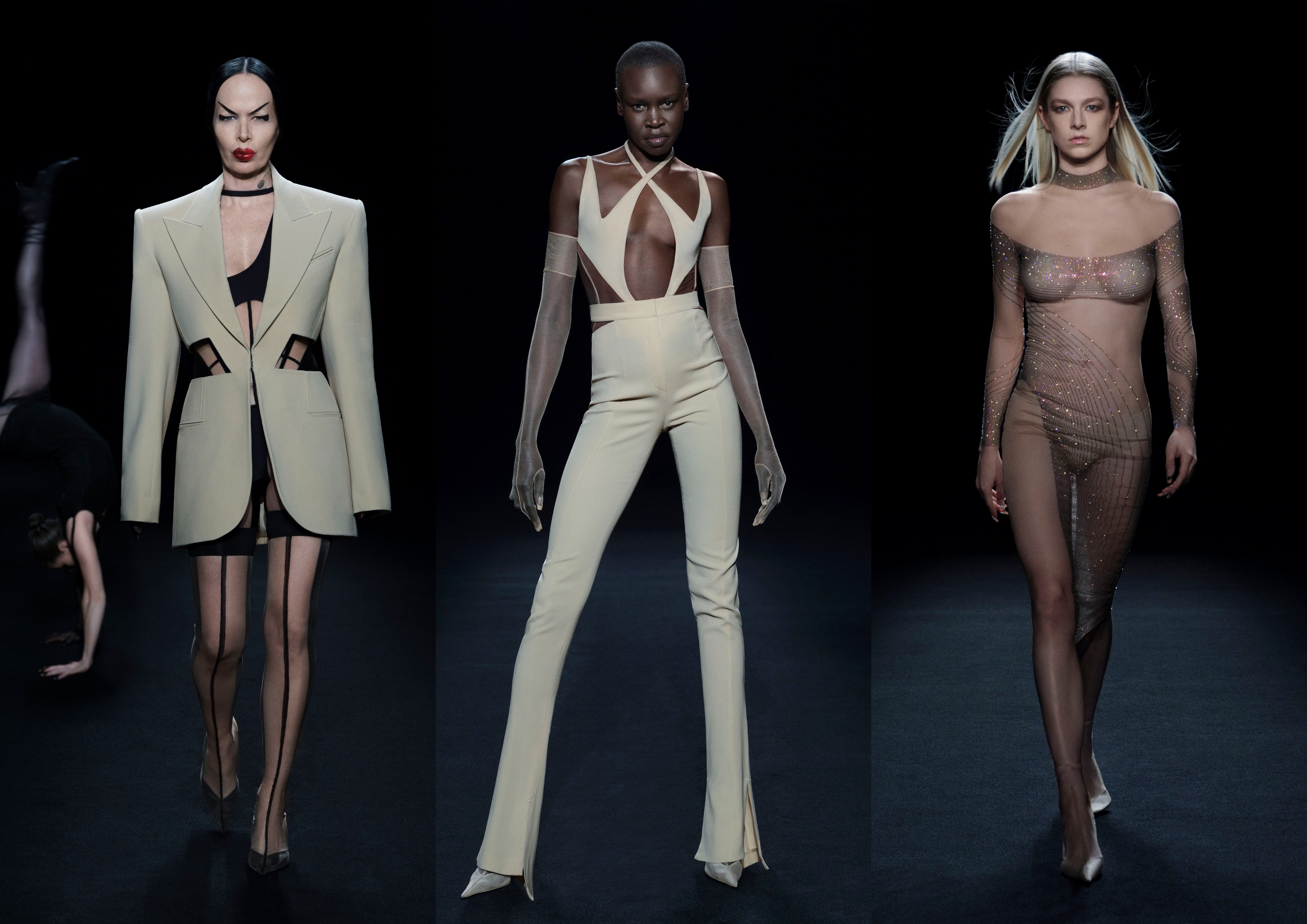Colecția se învârte în jurul pieselor din denim , firul comun al liniei. Salopete transparente mulate de corp și corsete încrustate cu cristale completează ținutele, îmbrățișând formele modelelor. Un spectacol punctat de apă în cascadă, în conformitate cu abordarea vizionară a casei Mugler.
