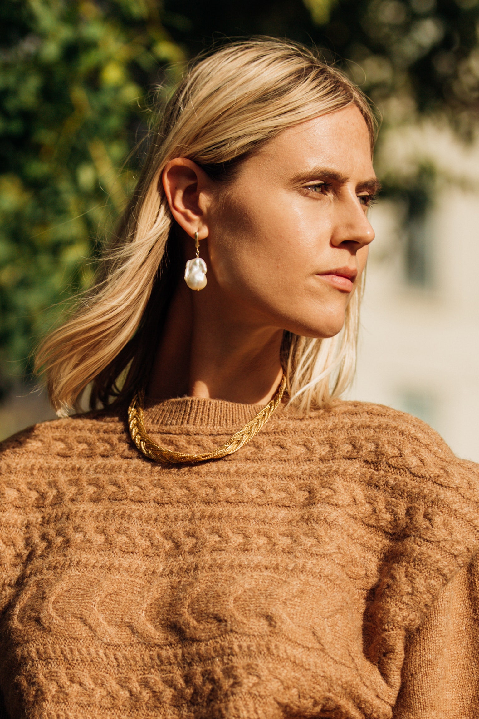 În decembrie, scoatem la iveală puloverele noastre elegante de Crăciun, pe care le combinăm cu cercei rotunzi aurii.