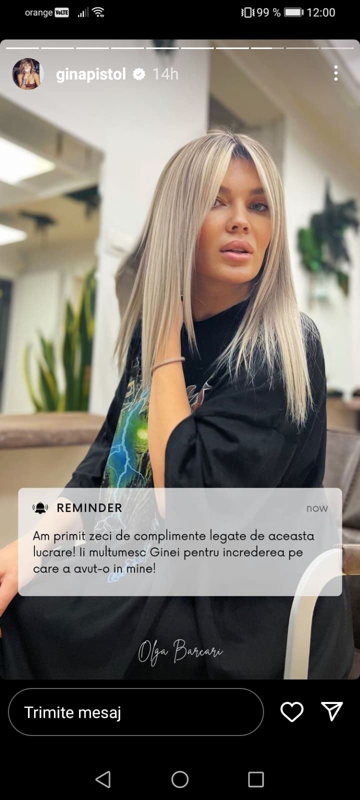 „Cât am stat, Olga? Opt ore? Opt ore mai târziu”, a spus Gina Pistol într-un instastory făcut la salon.