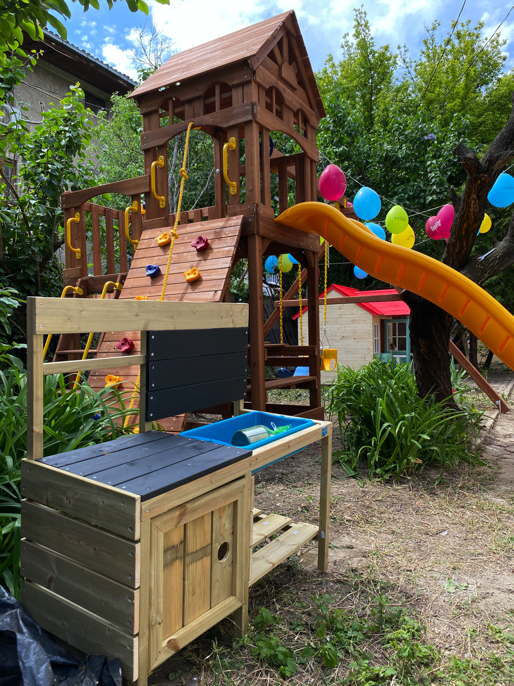 Apoi ne-am gândit: de ce nu și un tobogan, că merg bine împreună și poate și un loc unde să se cățere. Și uite așa, din aproape în aproape, a ieșit un mini parc de distracții superb. Și i-am dat Ritei de lucru cu așa o gospodărie mare! Are jardiniere la ferestre, trebuie să planteze flori, are de lucru în bucătărie, o grămadă de treabă! Dar până am ajuns la rezultatul asta nu a fost chiar simplu. Știam foarte bine ce-mi doresc și aveam pretenții destul de ridicate, adică nu plastic, obiecte de calitate, materiale safe pentru copii etc.