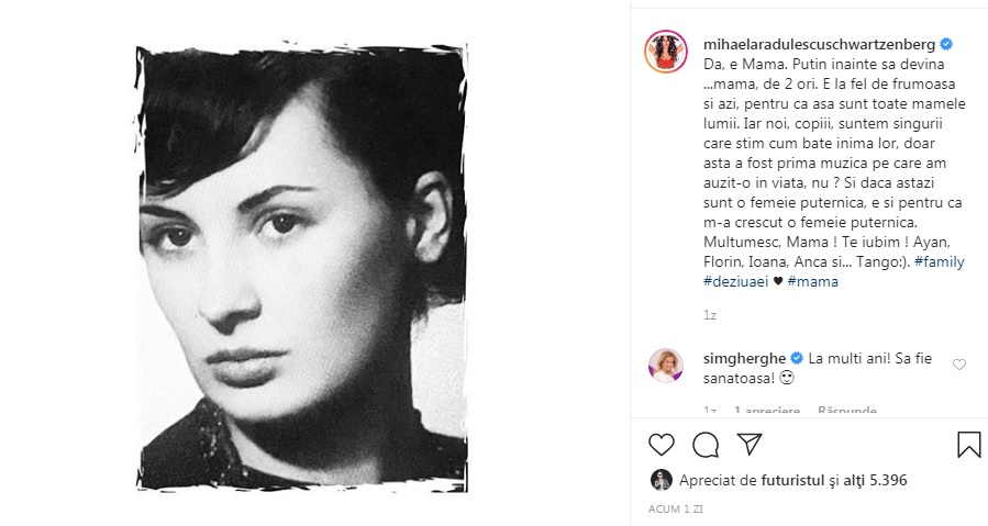 „Mama. Puţin înainte să devină ...mamă, de 2 ori. E la fel de frumoasă şi azi, pentru că aşa sunt toate mamele lumii. Iar noi, copiii, suntem singurii care ştim cum bate inima lor, doar asta a fost prima muzică pe care am auzit-o în viaţă, nu ? Şi dacă astăzi sunt o femeie puternică, e şi pentru că m-a crescut o femeie puternică. Multumesc, Mami! Te iubim”, a scris Răduleasca pe Instagram.