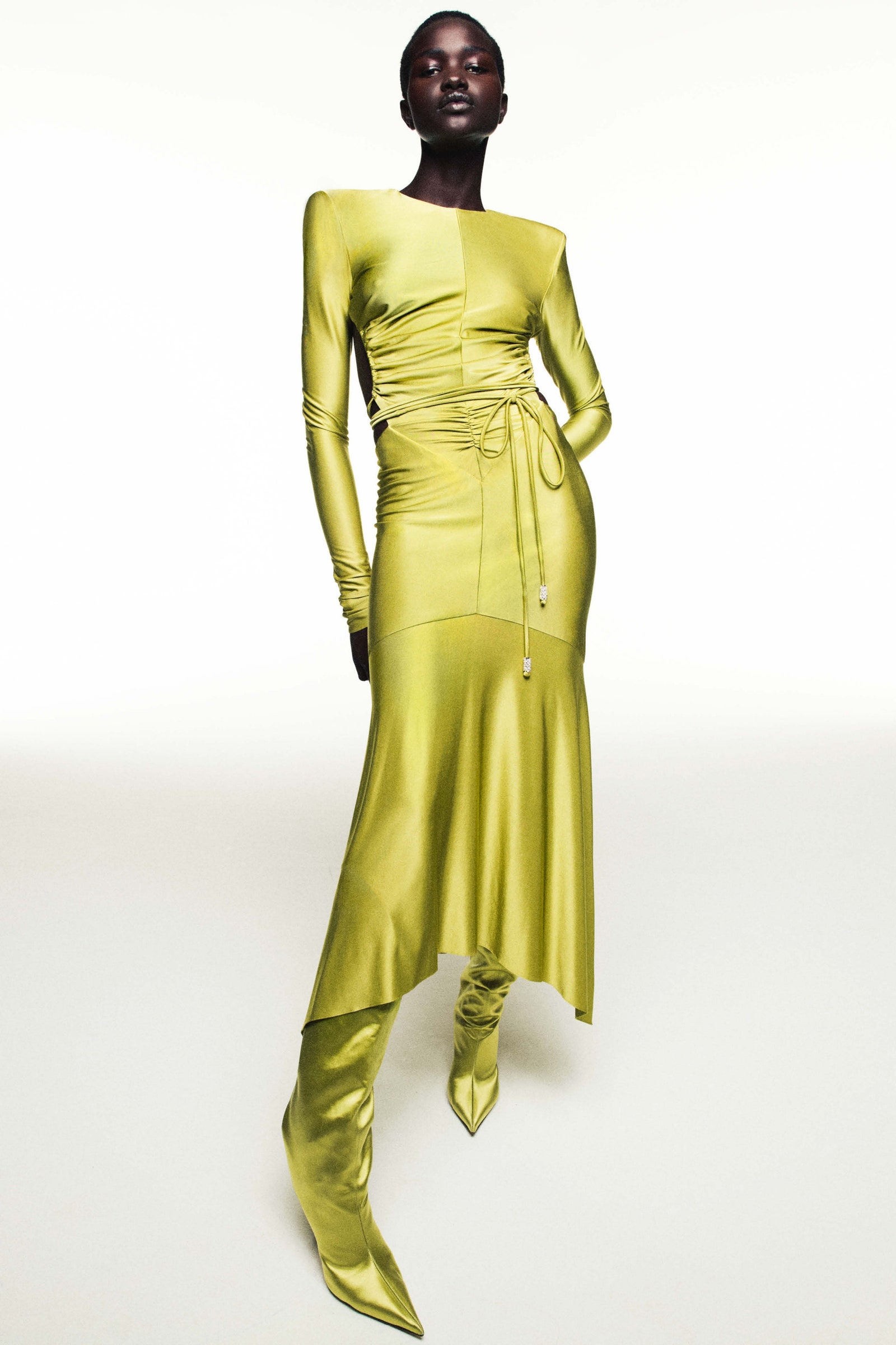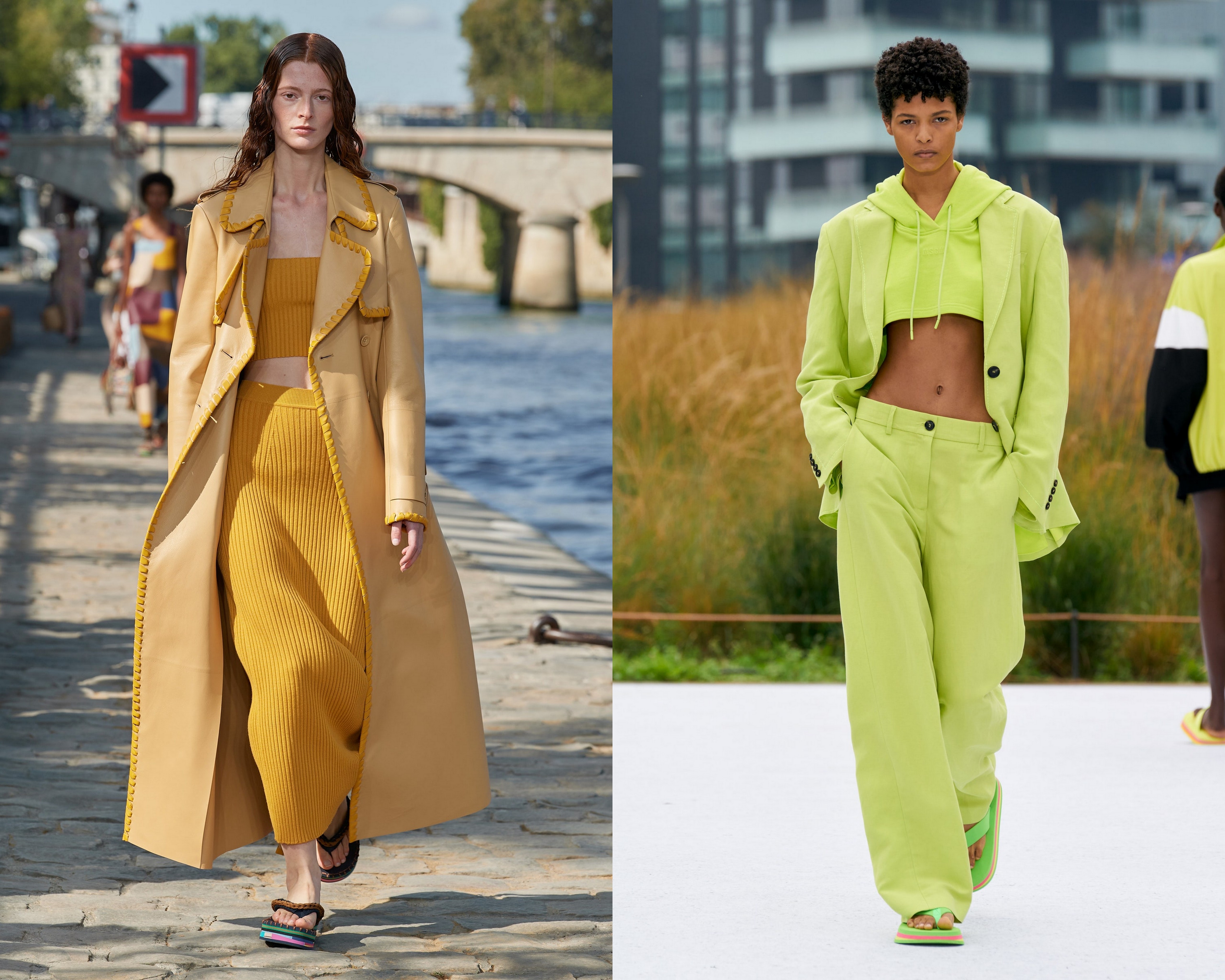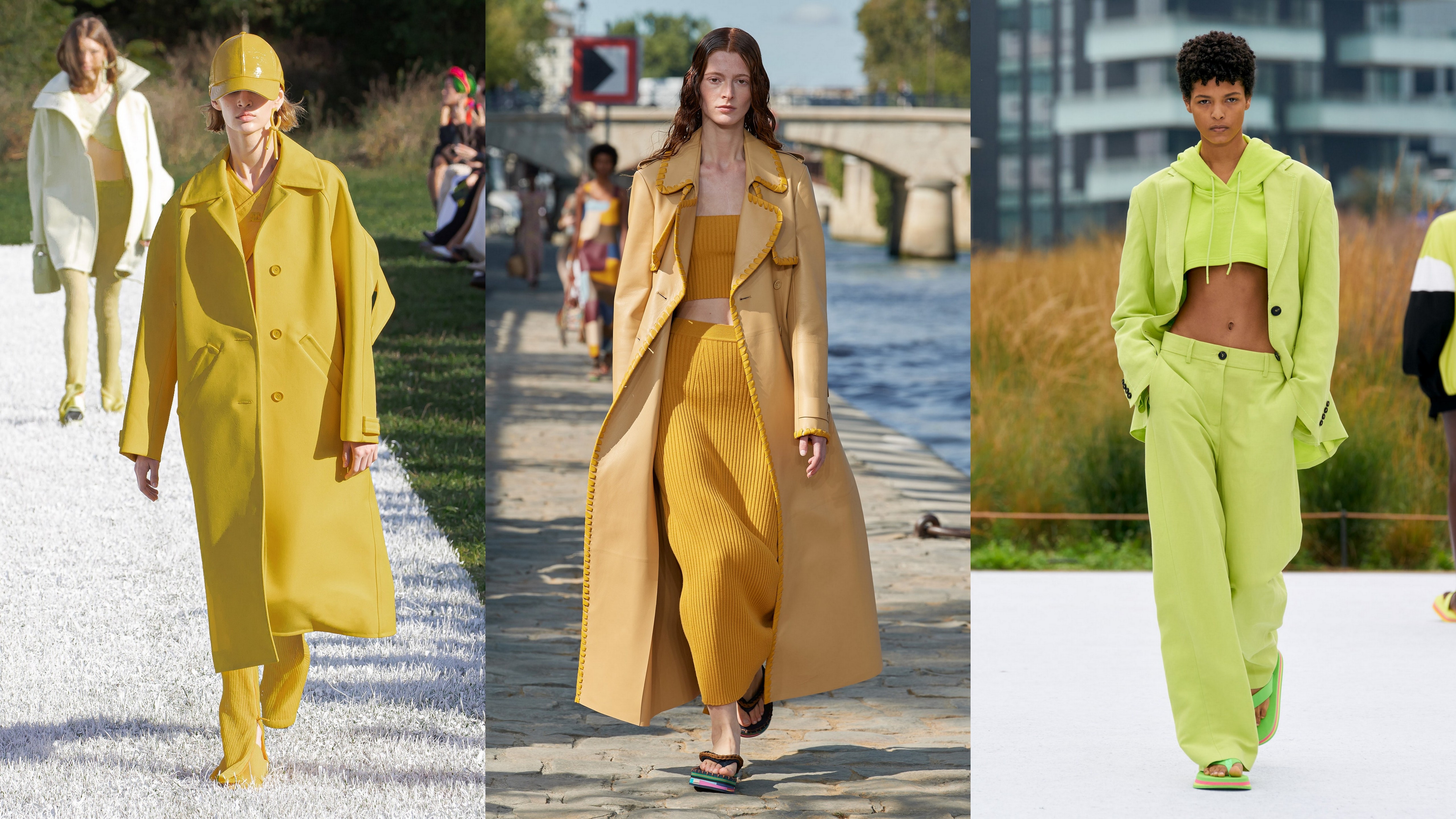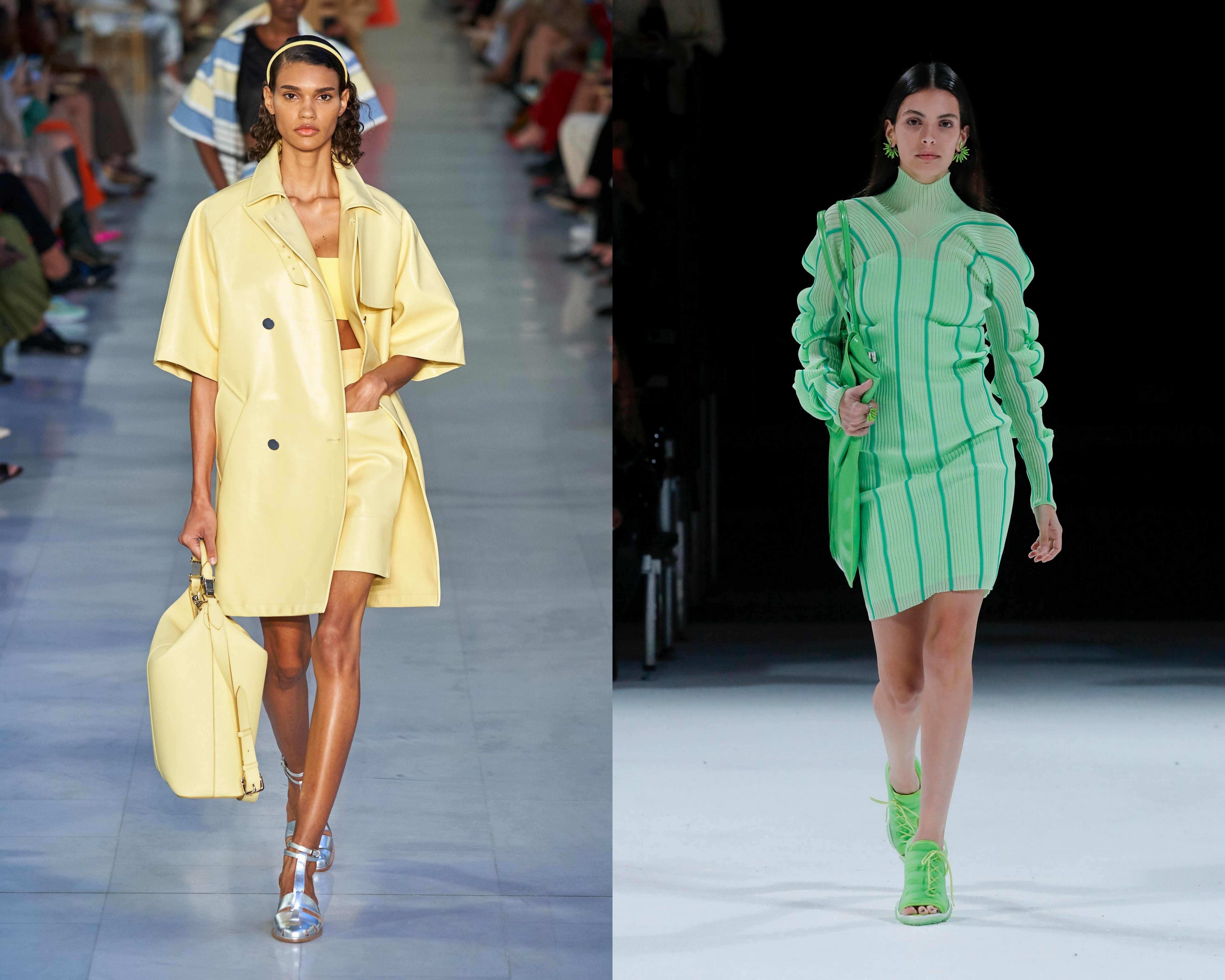 La Bottega Veneta, Versace și Max Mara, monocromul nu se limitează la ready-to-wear - genți, pantofi și îmbrăcăminte coordonate completează aspectul. La Courrèges identificăm galbenul canar. La Bottega Veneta, gențile și pantofii verzi irlandezi punctează ținuta. Alexandre Vauthier, la rândul său, oferă o rochie din satin verde crud și cizme asortate (din același material).