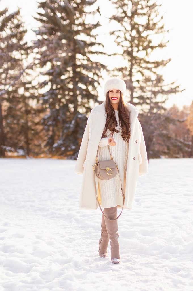Combinația clasică alb-negru este înca în trend în iarna aceasta. Unei rochii negre i se potrivește de minune un mantou alb buclat.