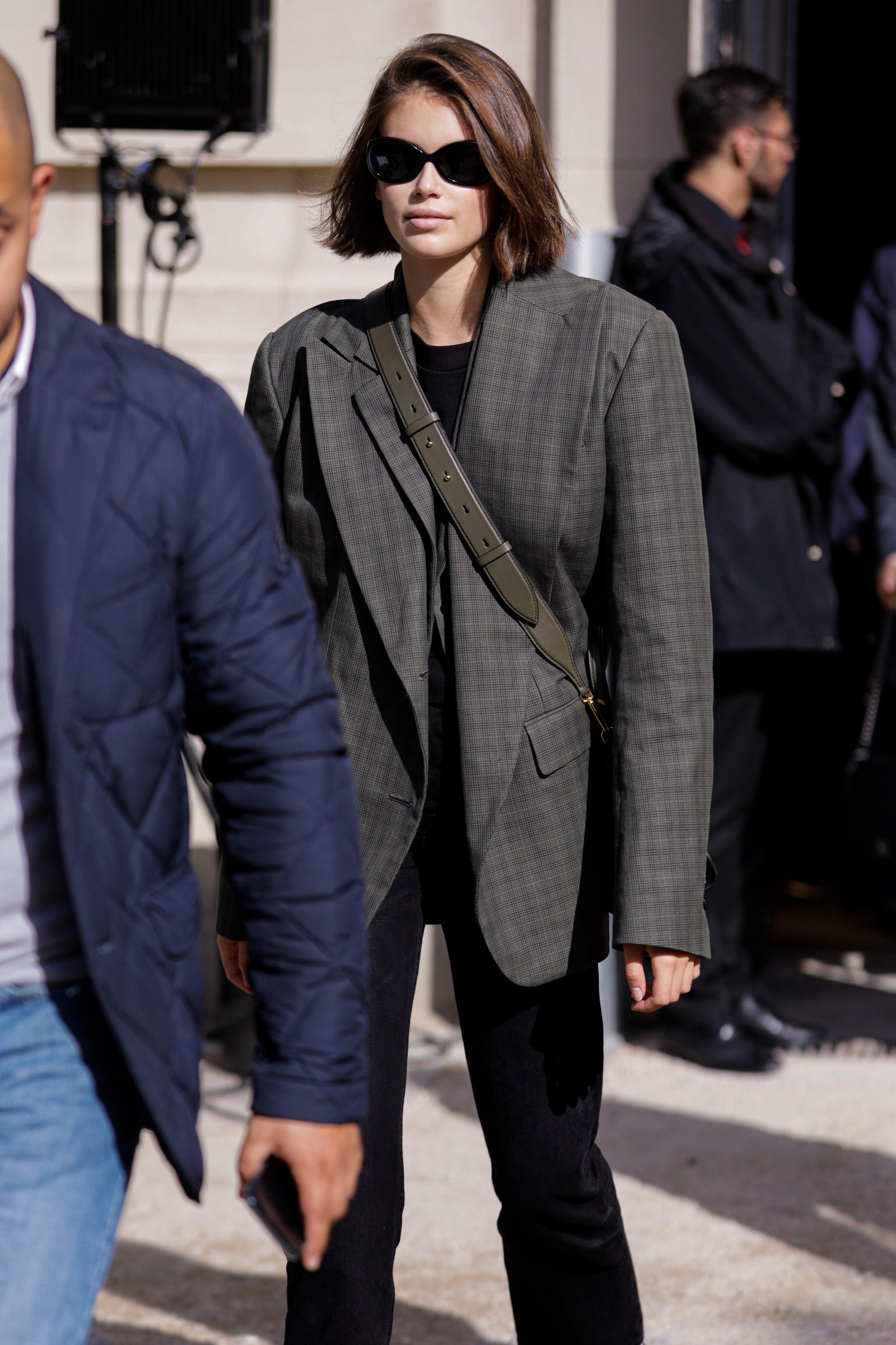 Kaia Gerber într-un blazer supradimensionat pe străzile Parisului.