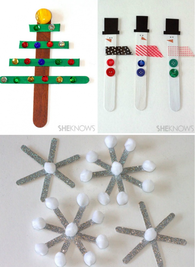 Aceste decorațiuni pot fi făcute cu ușurință de copii. Pentru a crea acești copaci frumoși de Crăciun, oameni de zăpadă și chiar fulgi de zăpadă aveți nevoie de bețe de la înghețată (se găsesc la set în comerț), vopsea, sclipici și puțină creativitate.
