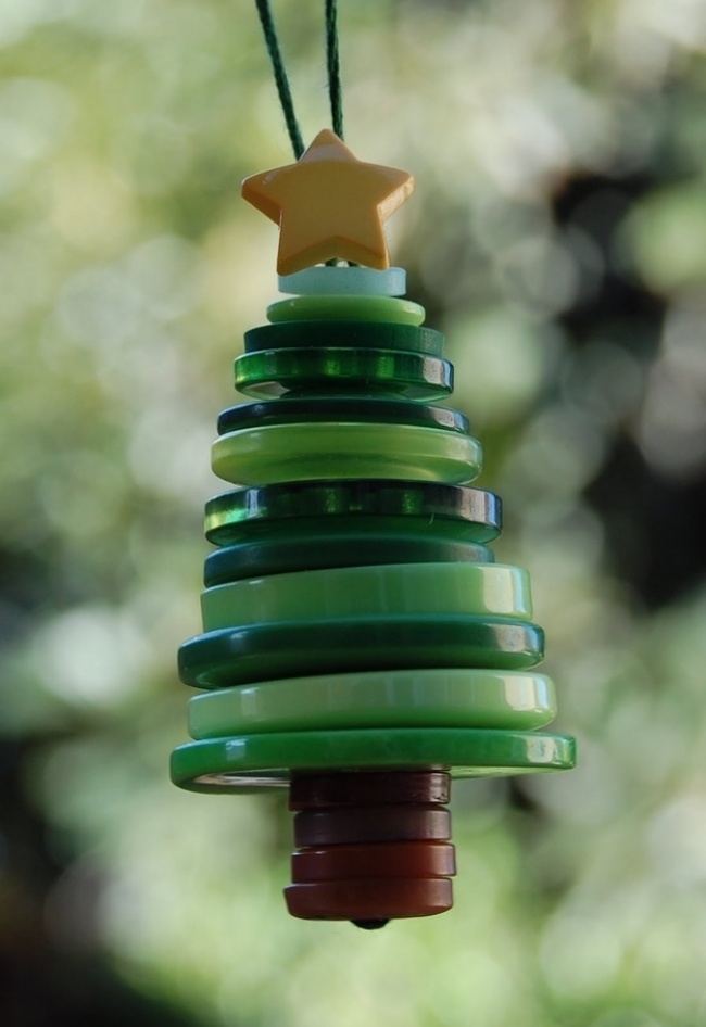 Strângeți câțiva nasturi versi de diferite dimensiuni și câțiva maro pentru a face trunchiul, apoi fixați-le împreună pe o sfoară. Decorați vârful brăduțului cu o steluță.