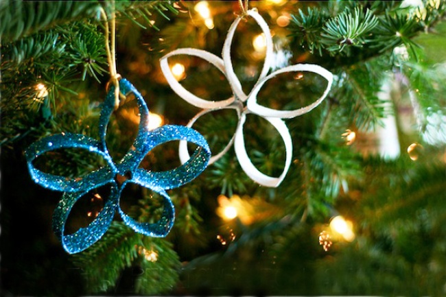 Tuburile din carton pentru hârtie igienică pot fi transformate într-un decor colorat. Tăiați tubul astfel încât să aveți mai multe părți mai mici, la aceeași lățime. Îndoiți bucățile astfel încât să pară petale de flori, apoi lipiți-le împreună pentru a forma o stea. După ce lipiciul este uscat, lipiți niște sclipici pe stele.