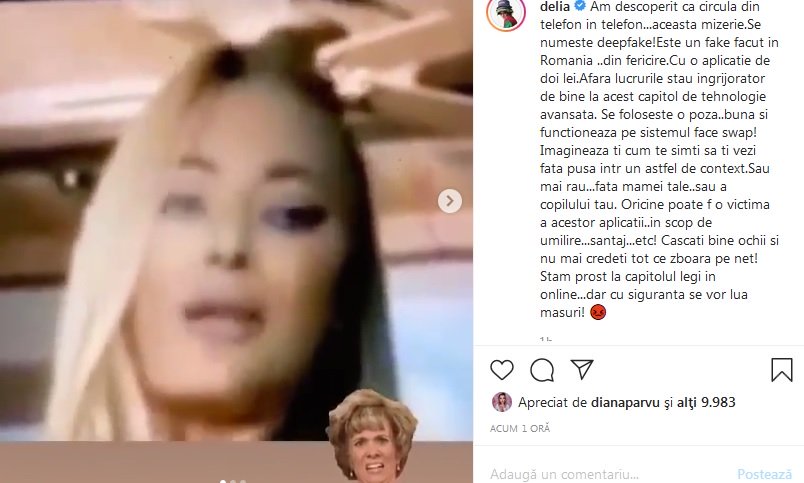 Una dintre cele mai populare soliste de la noi este cunoscută pentru felul franc în care își spune opiniile. Delia a decoperit că circulă pe internet un film porno trucat cu imaginea ei, descoperind astfel că i se poate întâmplă oricui pentru că nu există legi de acest fel. Solista a făcut și pe detectiva și a aflat cine e vedetă porno pe chipul căreia i s-a pus chipul. „Nu știu cum aș putea să încep chestia asta. Gen, ar putea să fie: „heeei, sunt Delia și tocmai am văzut că fața mea este folosită în fel și chip pe internet. Hahaha, ce amuzant… nu” sau aș putea să zic „voi ați auzit de „deep fake reality” și de toate aplicațiile astea care îți pun fețe faimoase?” Nu. E mult prea serios așa. Ar trebui să par mai detașată și mai relaxată și să fac puțin mișto de asta. Nu, nici așa nu pot. Nu știu cum să abordez situația asta. Și totodată trebuie să fiu puțin cenzurată, pentru că probabil în momentul ăsta privesc și copii”, a spus Delia pe contul ei de instagram pe instastory. „Din fericire, trăiesc în România și probabil că aici tehnologia nu a evoluat atât de mult, pentru că filmulețul în cauză are niște defecte monstruoase, ca să zic așa, adică aplicația aceea efectiv sare de pe față când actrița se mișcă mai brusc și se vede că e fals. Bine, văd oamenii cu puțină… cu un pic de inteligență peste. Majoritatea probabil că nu înțeleg despre ce este vorba, văd o imagine și nu se uită atent la detalii și la faptul că fața e nenaturală, mișcatul ochilor este nenatural și este desprins parcă dintr-un film de groază. Amuzant, dar nu, am descoperit și după ce poză au făcut toată treaba asta, pentru că am recunoscut machiajul și lumina și mi-am dat seama cine a făcut acel machiaj.