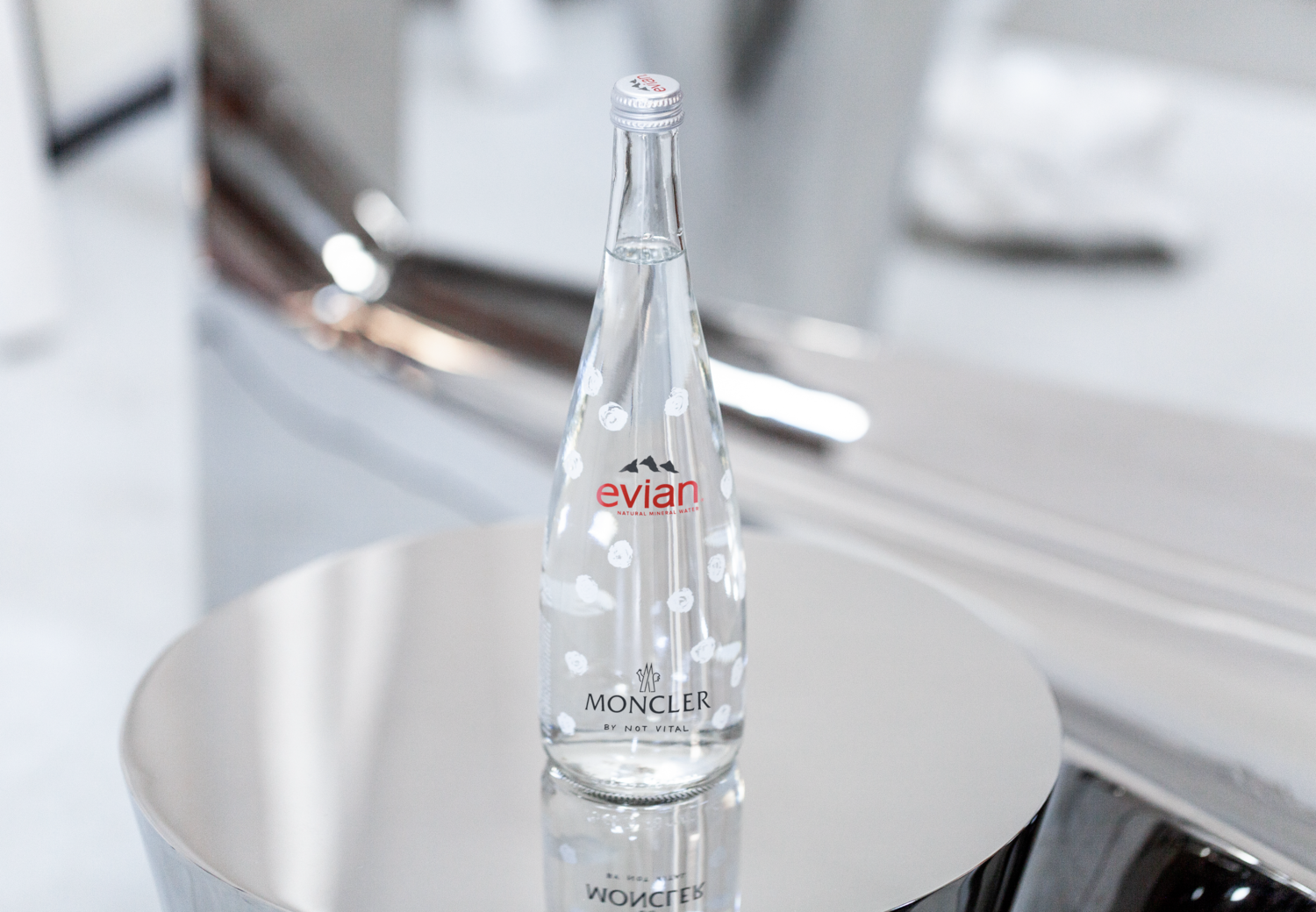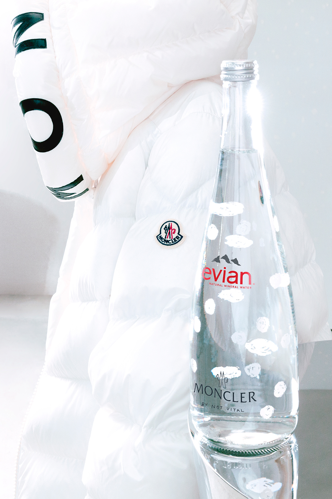 De asemenea, este pentru prima dată când compania de apă îmbuteliată a lucrat cu un artist contemporan, asociația dezvăluie un design care este dedicat locului de unde provin Evian și Moncler.