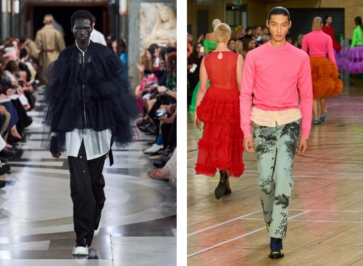 Această nouă abordare a fost ilustrată cu piese masculine care combină stilul eteric și delicat al Simonei Rocha cu preocupări mai utilitare. Am putut vedea pantaloni de trening din nailon cu fermoar, jachete bomber cu volane de tul, trenciuri din brocart și mătase, cămăși adunate și pantaloni cu nasturi cu dungi fine.