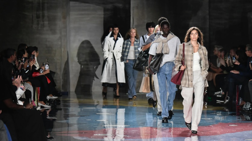 Rafinamentul materialelor Bottega Veneta este combinat cu simplitatea look-urilor de zi cu zi, cum ar fi o cămașă în carouri combinată cu pantaloni largi din denim purtați de supermodelul Kate Moss.