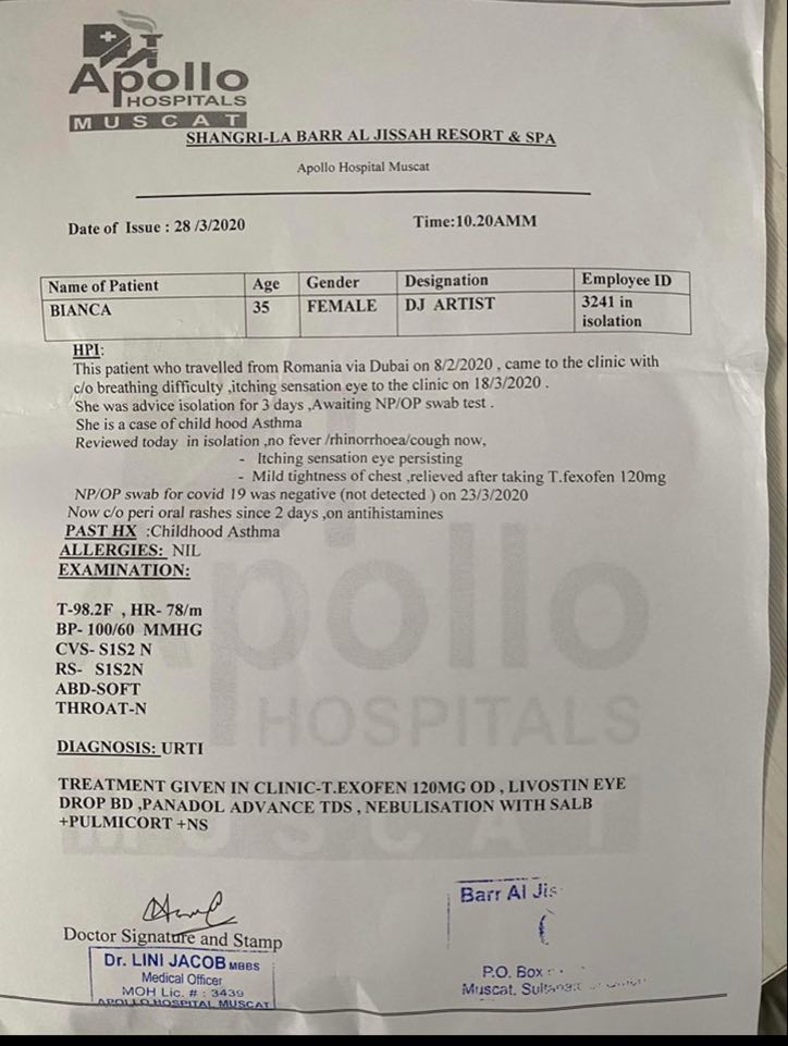 limba engleză, un avertisment că e posibil să fiu infectată. Intrarea etajului la care locuiam era blocată. Pedeapsa în Oman pentru părăsirea carantinei este 6 luni de închisoare. Asta s-a întâmplat când erau doar 33 de cazuri de Coronavirus. Felul în care această țară manageriază acest dezastru natural (sau cine știe poate e creat de mâna omului) este impresionat. Au închis aeroportul la primele 100 de cazuri iar persoanele care trebuiau să se întoarcă în țările mamă au fost escortate de avioane militare. Testul Corona este neplăcut