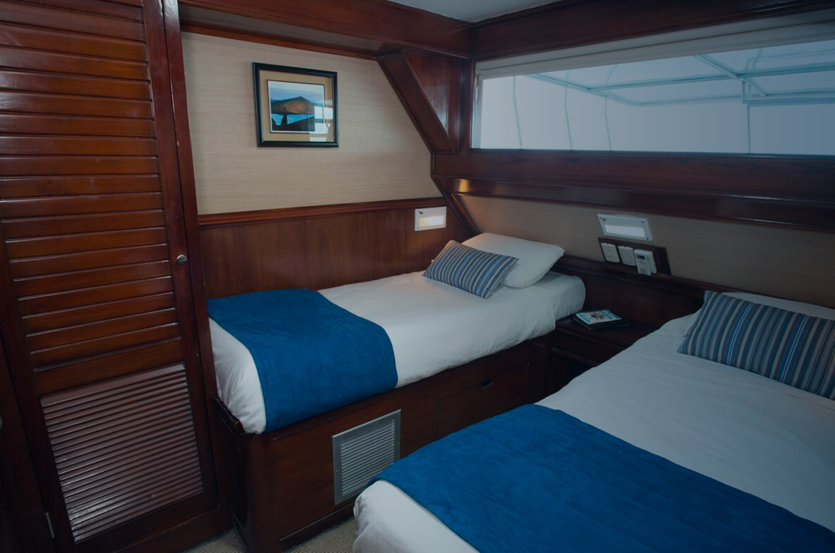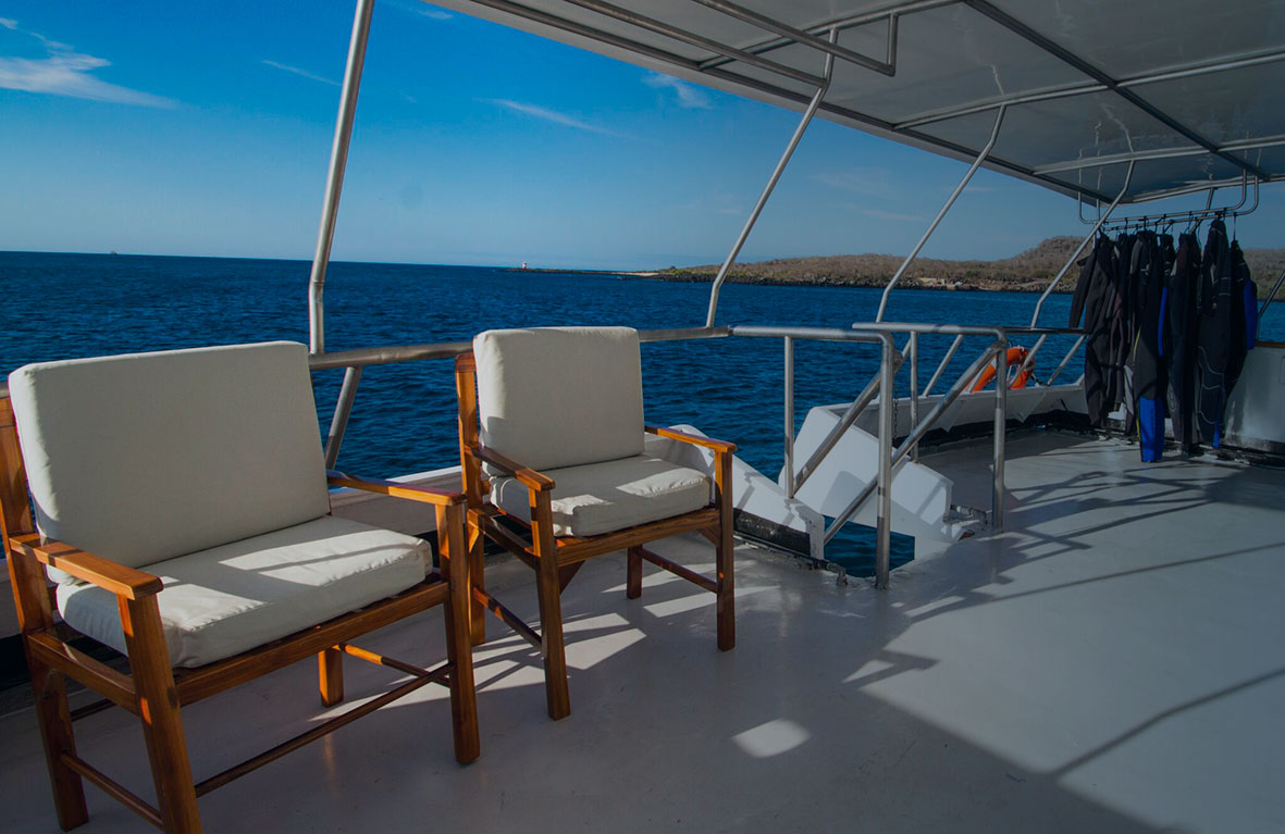 Materialele folosite la bord includ pietre și cristale exotice și tec pietrificat. În salonul în care se țin prelegeri de geografie și fotografie, tavanul este pictat manual pentru a imita cofrele din lemn masiv, în timp ce tapițeria gri și albă și canapele din piele transformă totul într-un spațiu luxos, liniștitor. Lămpile evocă râurile de lavă ale arhipelagului, iar mesele de cafea sunt realizate la bază din rădăcinoase răsucite care reflectă flora specifiză zonei. Cele mai multe obiecte de mobilier au fost realizate de meșteri și tâmplari din Ecuador, inclusiv noptiere din marmură, paturi imense, fotolii și șezlonguri în locul preferat al lui Muirragui: cada cu hidromasaj.