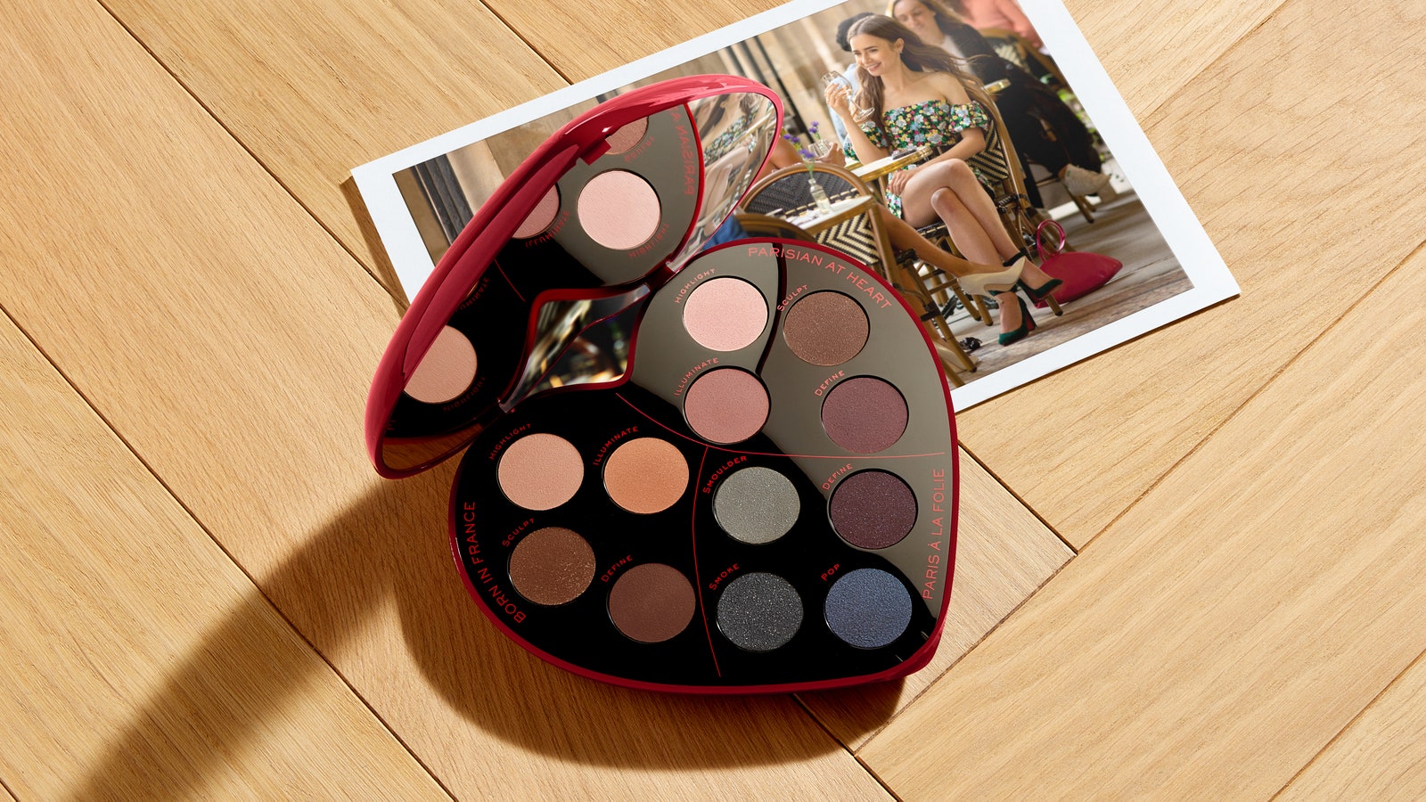 O paletă în formă de inimă, ca un clutch de seară pe care Emily Cooper l-ar putea purta la o cafea cu bunele ei prietene Mindy și Camille într-o braserie pariziană, este vedeta acestei colecții în ediție limitată. Conține 12 nuanțe de fard de pleoape, grupate în 3 familii de culori, inspirate de cele 3 prietene din serie.