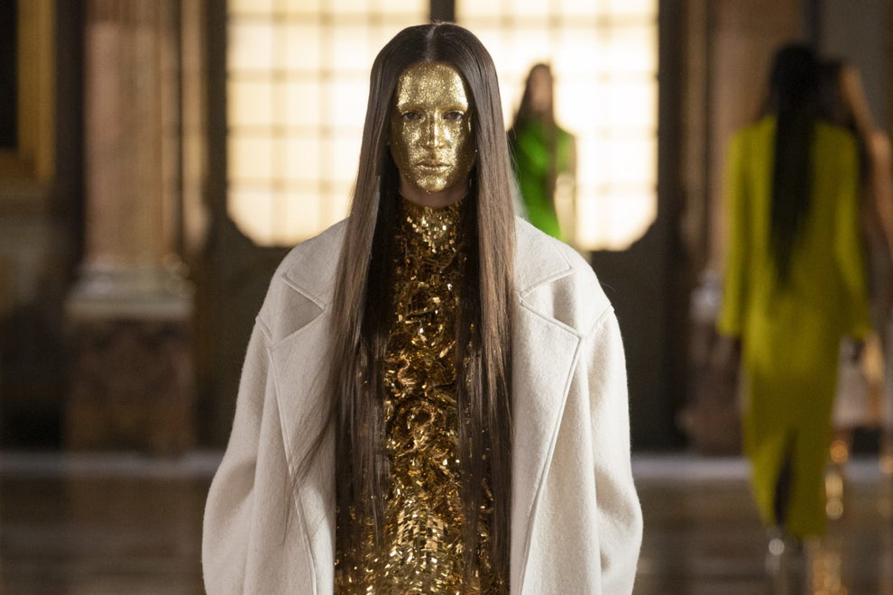 De asemenea, completând acest aspect disco, multe dintre modele au pășit pe pistă acoperite cu sclipici pe față. Responsabil pentru machiaj a fost îndrăznețul make-up artist Pat McGrath.