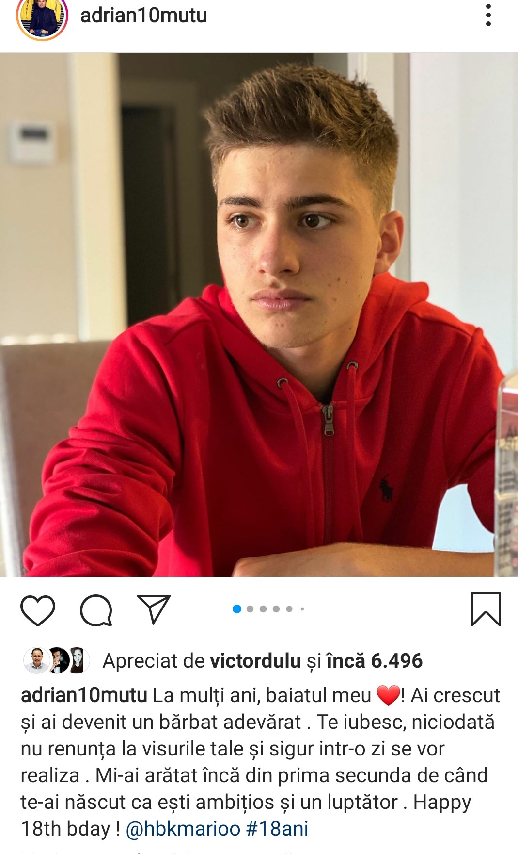 „La mulți ani, băiatul meu ❤️! Ai crescut și ai devenit un bărbat adevărat. Te iubesc! Niciodată nu renunța la visurile tale și sigur, într-o zi, se vor realiza. Mi-ai arătat încă din prima secundă de când te-ai născut că ești ambițios și un luptător. Happy 18th b’day!”, a scris antrenorul de fotbal Adrian Mutu, pe rețelele de socializare în mediul online. Mario Mutu este rezultatul iubirii dintre Adrian Mutu și actrița Alexandra Dinu, cei doi fiind căsătoriți în perioada 2001 și 2003.