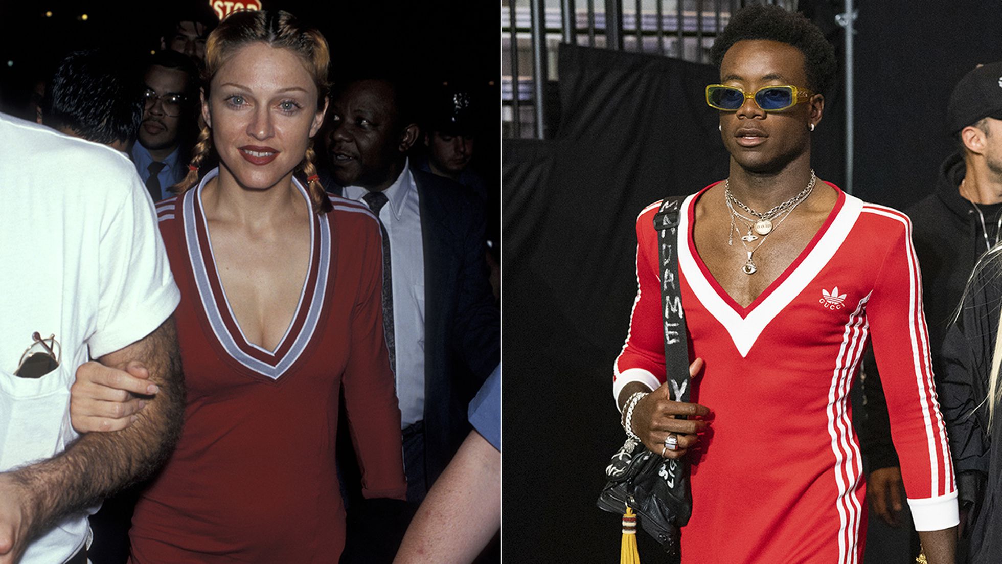 O alegere aproape identică cu rochia Adidas purtată de Madonna la premiera din New York a filmului Something to Remember. Cântăreața a ales să lase deoparte costumul clasic haute couture și să mizeze pe o rochie Adidas maro cu decolteu în V pronunțat. În picioare a avut adidași maro.