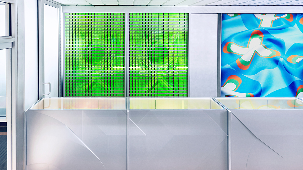 Spațiul este elegant și minimal, dar departe de a fi simplu - la fel ca toată cariera muzicală a lui Ocean, este evazivă și atrăgătoare. Vitrinele albe texturate prezintă bijuteriile pe fundalurile luminoase din chartreuse. Pe peretele din spate, există o imagine a unei eșarfe de mătase, iar cutiile de bijuterii verzi sunt primate de impresii de figuri extraterestre similare cu cele prezentate pe pandantive în întreaga colecție. La fel ca piesele prezentate, culorile luminoase și distincte ale magazinului ne aduc în minte futurismul anilor '90 și începutul anilor 2000.