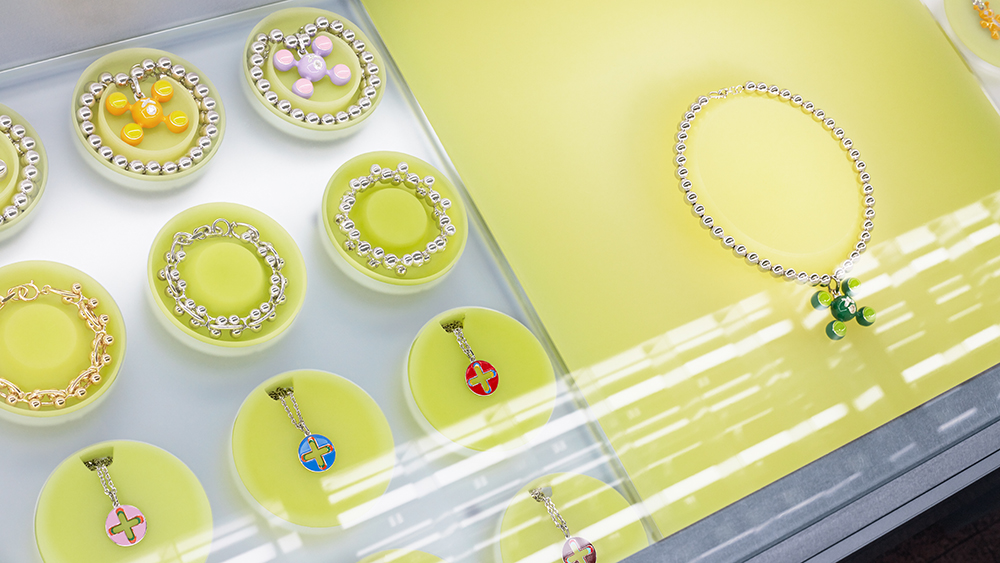 Proiectat de ANY, duetul de arhitectură modernistă compus din Nile Greenberg și Michael Abel, spațiul încorporează aluminiu și uretan și este perfect în conformitate cu decadența jucăușă a bijuteriilor pe care le vinde. Piesele variază de la 395 dolari pentru un inel de argint la 1,898 milioane de dolari pentru un colier din aur alb acoperit cu diamante. Marca vinde, de asemenea, eșarfe de mătase, care au un preț cuprins între 230 și 460 de dolari, iar în curând a avea loc o colaborare cu Prada, dar puține detalii au fost dezvăluite dincolo de o mână de fotografii din catalog.