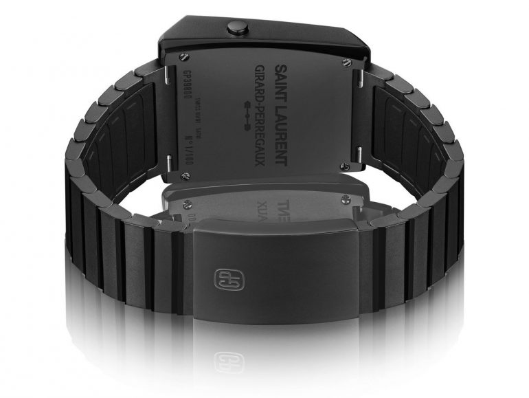 Semnătura Saint Laurent apare pe fondul carcasei. Completand editia limitata este bratara din ceramica neagra cu captuseala de cauciuc dedesubt. Ceasul Girard-Perregaux Casquette 2.0 Saint Laurent 01 este limitat la doar 100 de exemplare, fiecare la un preț de 6.700 de dolari.