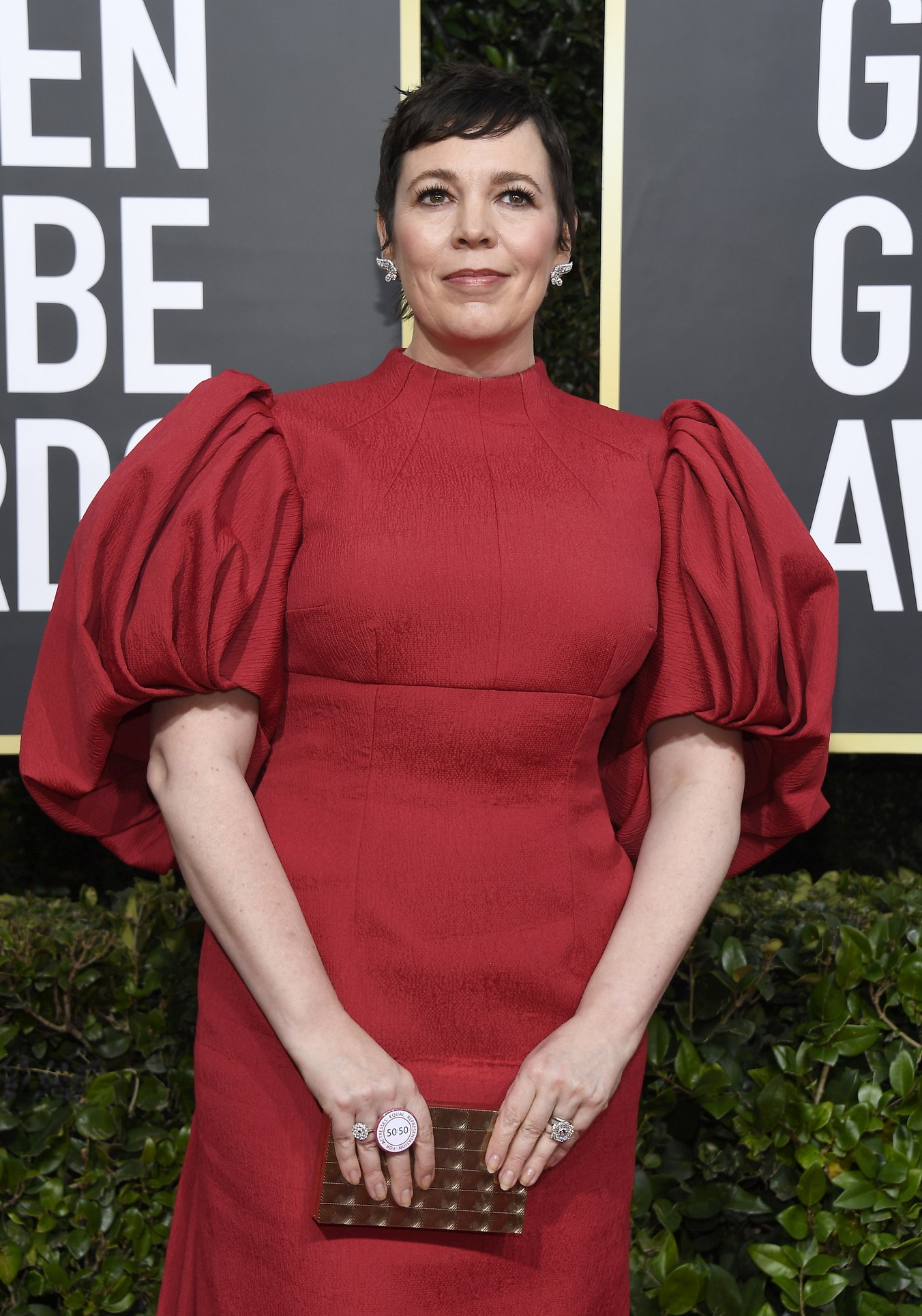 Olivia Colman, din The Crown, a purtat mâneci roșii masive.
