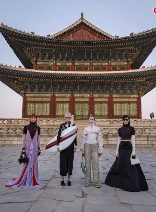 Colecția pentru această Croazieră 2024 preia această idee a legăturii dintre trecut și viitor, antic și contemporan, tradițional și modern. În fața pavilionului sălii tronului, Geunjeongjeon, total iluminat pentru ocazie, și cu fața la zgârie-norii orașului, epocile și stilurile dialogează, se ciocnesc, se amestecă. Garderoba evocă look-ul de stradă al tânărului coreean în pantaloni largi și un top decupat cu trei dungi sau într-o versiune mai burgheză într-o fustă cu talie midi cu fante, îmbrăcată cu un corset cu mâneci bomber detașabile. Nodurile Otgoreum preluând codurile hanbok-ului, costumul tradițional coreean, dau peste bustul rochiilor de seară din mătase roșie sau o haină de satin roz.