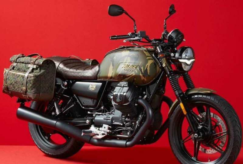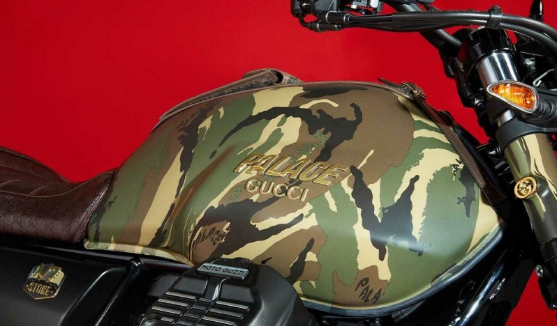 Pentru acest proiect, V7 Stone de la Moto Guzzi a fost aleasă să facă parte din viitoarea colecție Palace X Gucci. Modelul camo și gențile Gucci asortate (și șaua Gucci din piele maro, completată cu modelul Guccissima) conferă o estetică robustă, dar scumpă, în timp ce accesoriile negre fac ca emblema aurie V7 Stone și logoul lustruit Palace X Gucci să iasă în evidență cu atât mai clar.