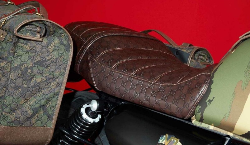 Motocicleta are roți negre, faruri, oglinzi, evacuare, carcase laterale, carcase motor; detaliile sunt destul de impresionante, iar rezervorul este acoperit cu un imprimeu de camuflaj realizat de Palace și împodobit cu o insignă aurie Palace Gucci. De asemenea, șaua din piele maro închis prezintă modelul Guccissima și este completată de un set de bagaje de voiaj Gucci montate pe ambele părți.