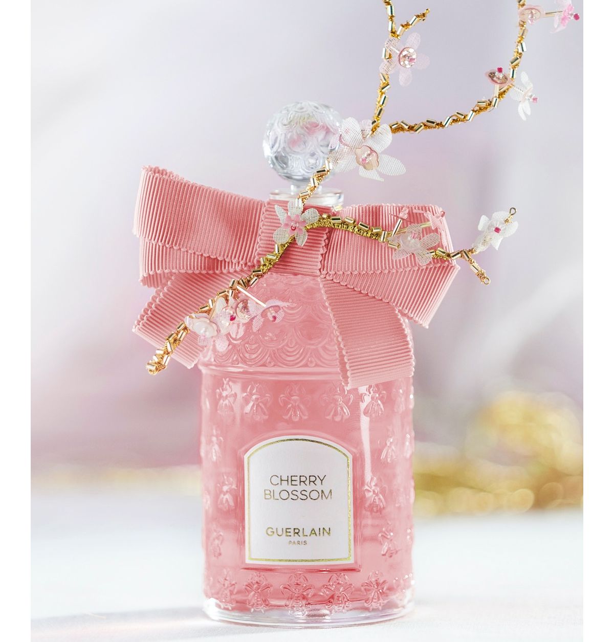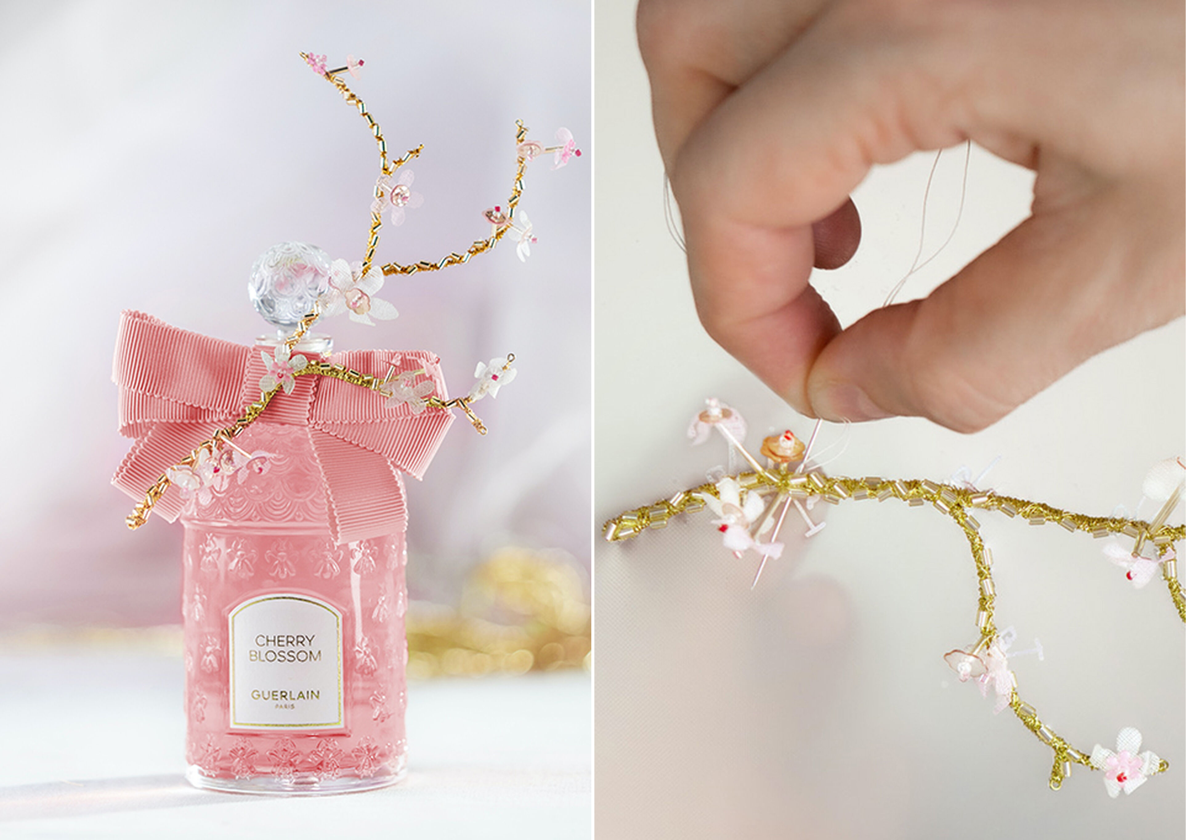 Pentru lansarea Cherry Blossom Millésime, Guerlain a colaborat cu casa pariziană de broderie, Ateliers Vermont, pentru a-și proiecta decantorul emblematic – sticla de albine. Vine cu o broderie florală tridimensională care seamănă cu o ramură de cireș auriu în floare, sculpturi din perle aurii și tuburi și corole din material roz și perle.
