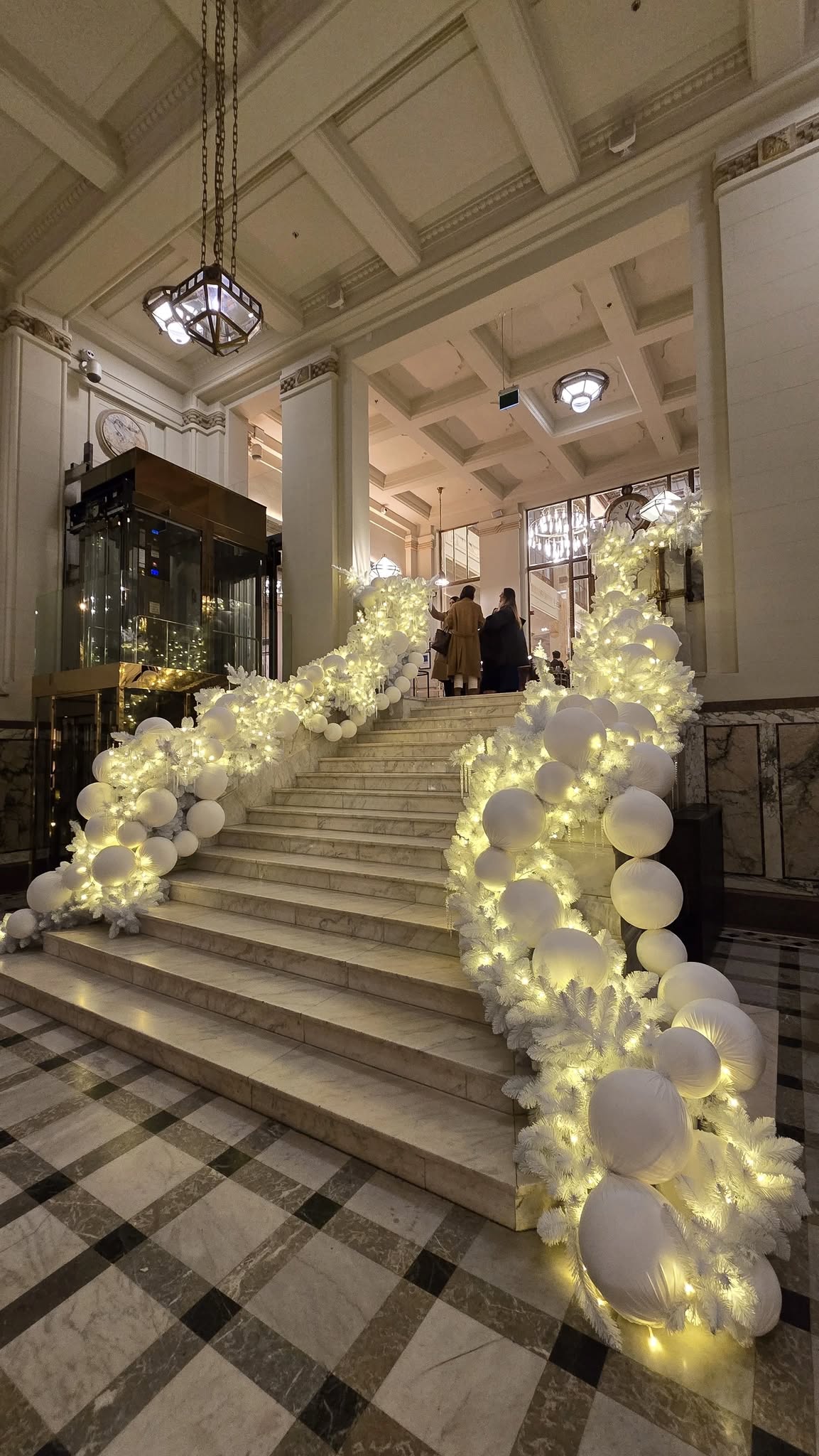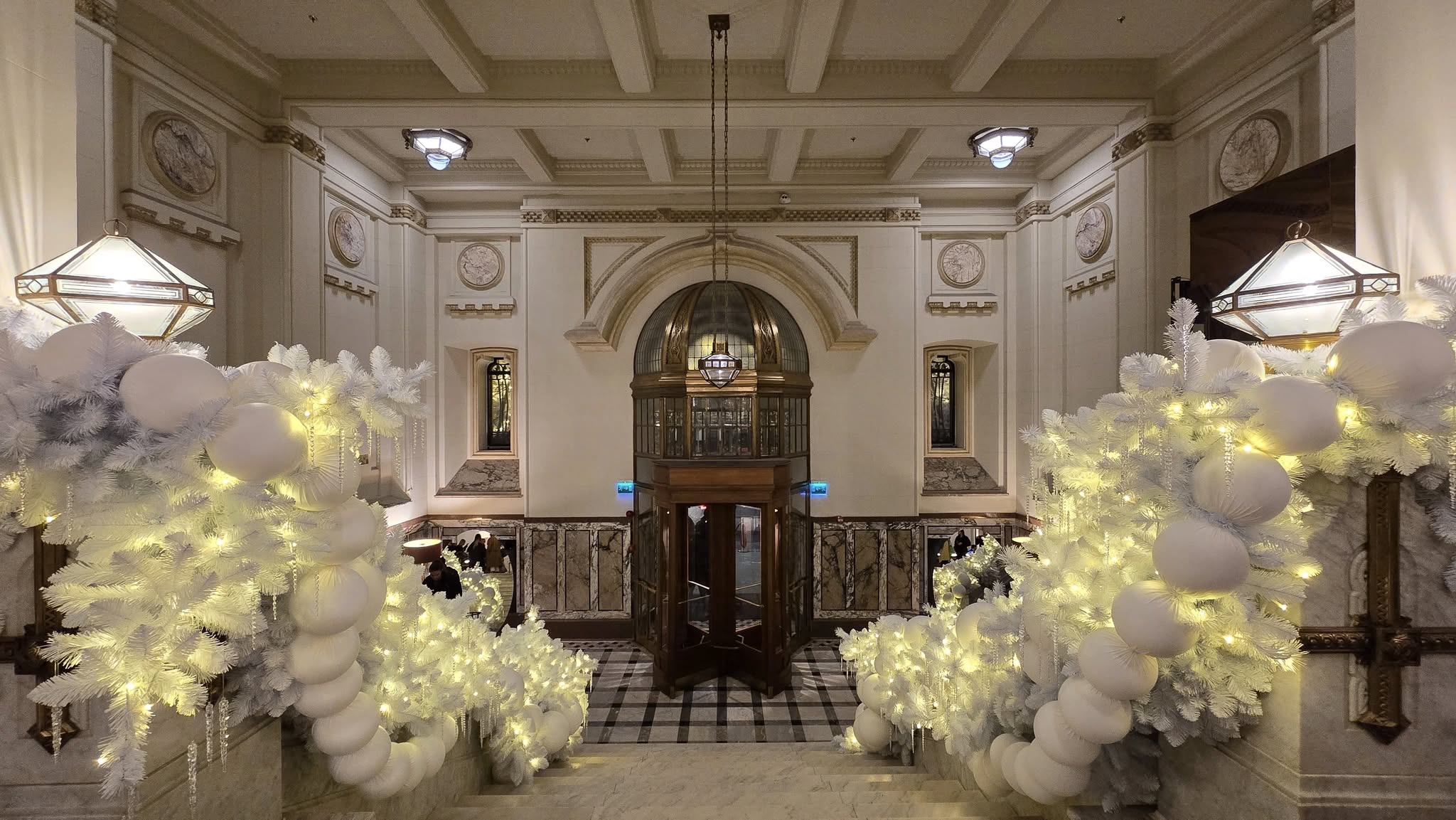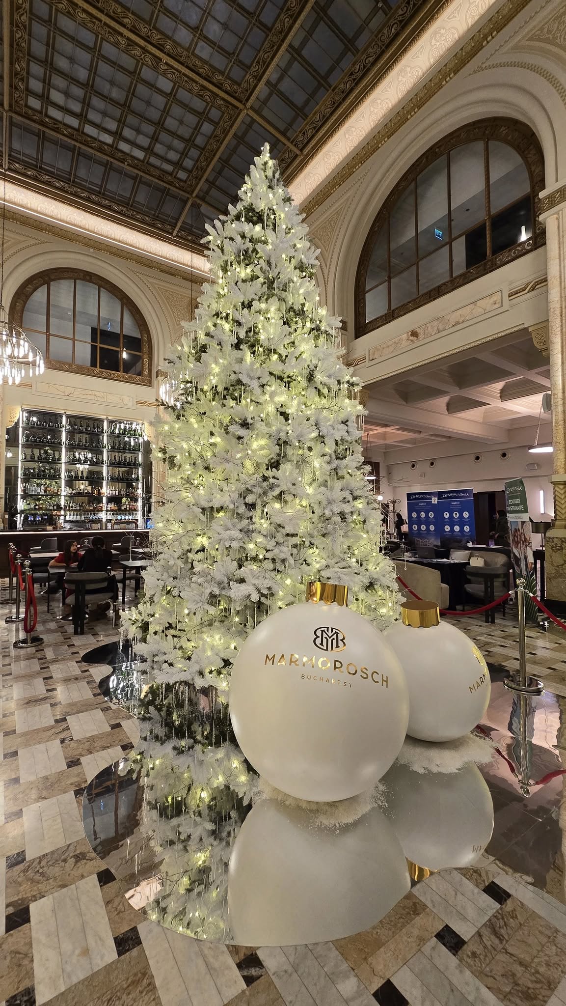 Atât la intrarea în hotel, cât și în interior, sunt amplasate globuri uriașe de brad cu alb și auriu.