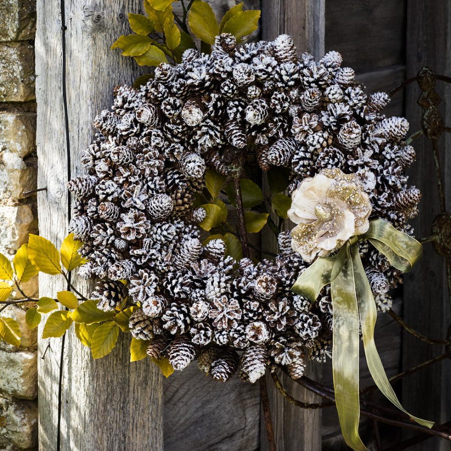 Pregătește-ți casa de Crăciun începând cu ușa de la intrare. Confecționează o coroniță din conuri de pin. Pentru un aspect mai „înghețat”, pulverizează pe conuri vopsea gri metalizat și zăpadă artificială. La final, leagă-i o panglică din satin și lipește un trandafir obținut din săpun.