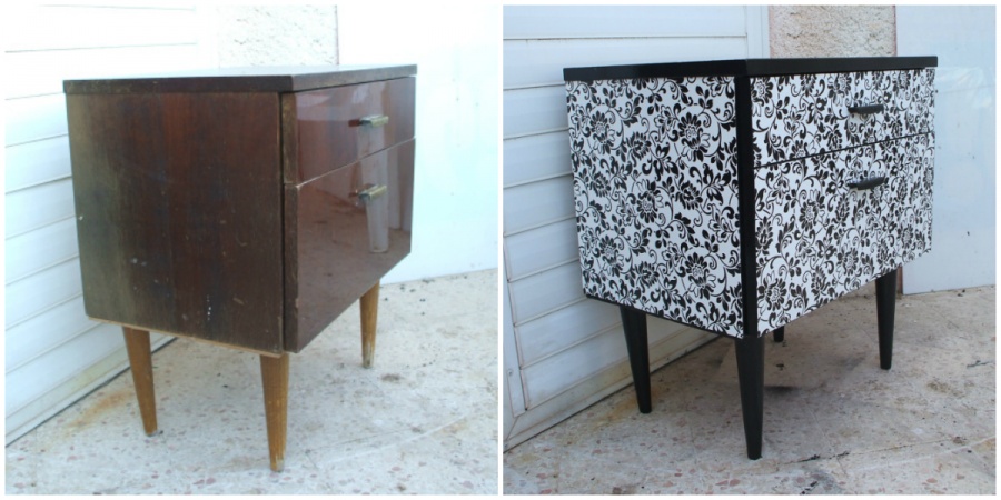 O noptieră veche lăcuită devine una elegantă în nuanțe de alb cu negru
