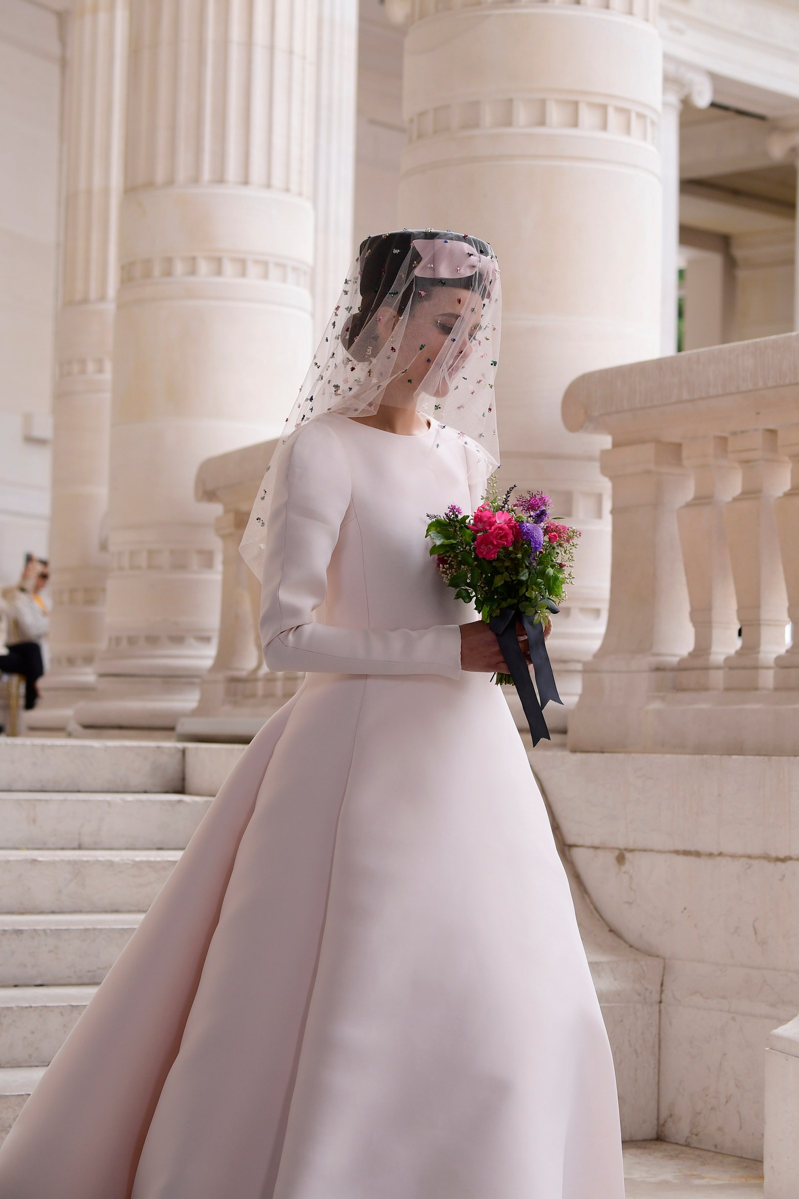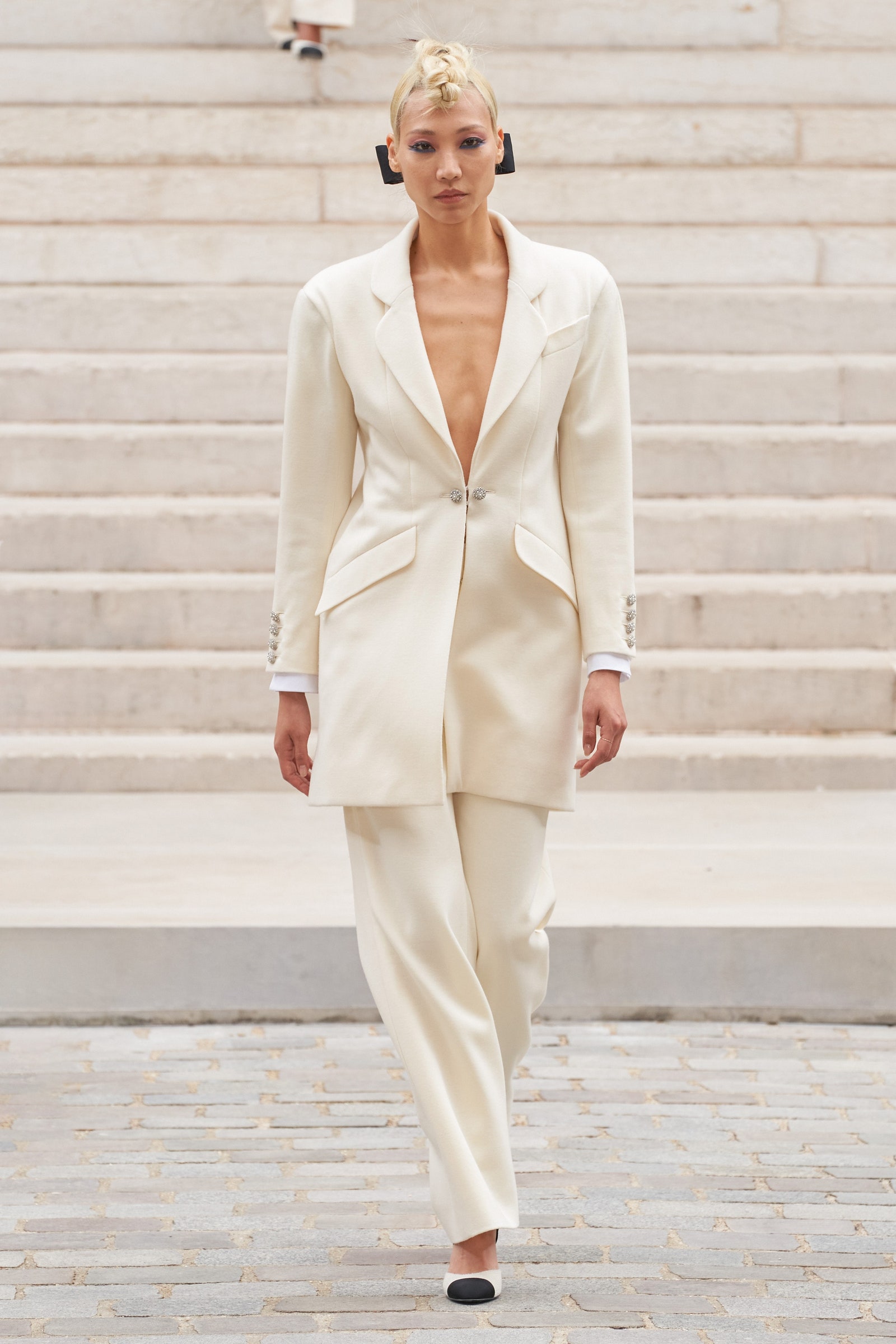 „Am fost inspirați de artiștii Belle Époque [o perioadă din istoria Franței și Europei, din 1871 până în 1880]”, spune Damien Boissinot. „Virginie își dorea o femeie puternică, sofisticată, cu un pic de piatră în împletituri. Am rămas foarte Chanel cu arcurile fixabile .”