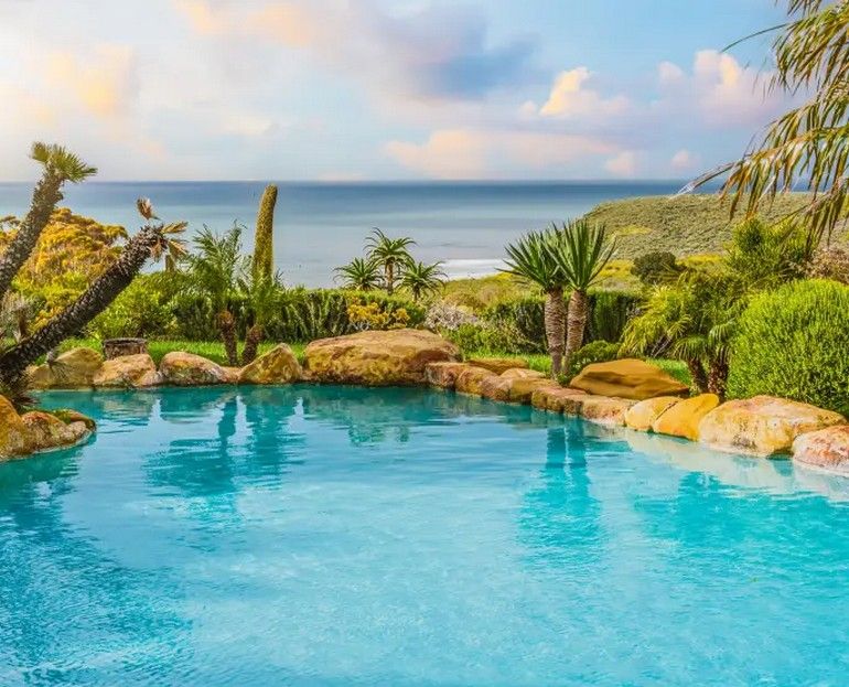 Această proprietate masivă cu vedere la ocean este completată cu o piscină mare, în stil lagună, împrejmuită cu palmieri.