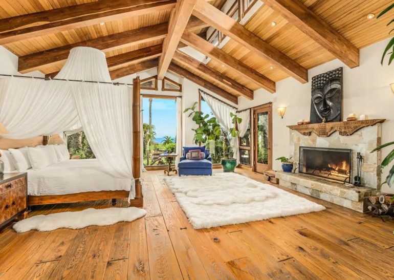 Dormitorul principal arată ca o vacanță între patru pereți, cu ferestre din podea până în tavan, un șemineu confortabil și un pat cu baldachin din lemn flancat cu covoare moi ca norii pe două părți.