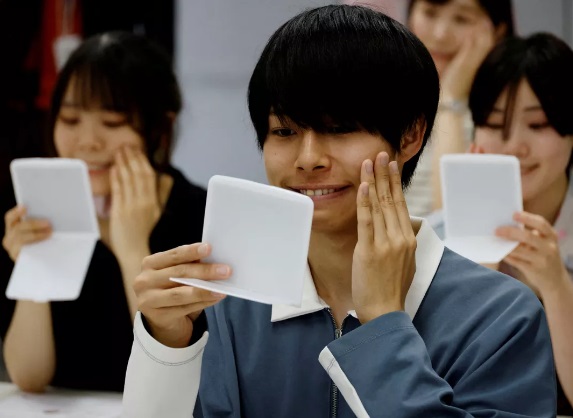 Japonezii pot merge la lecții de grup sau private, numite și „cursuri de zâmbet”. Așezați la o masă, obiectivul principal al participanților este să își poată îndepărta masca în mod natural, înainte de a exersa mai multe întinderi ale mușchilor faciali. Pe 5 iunie, agenția Reuters a pătruns într-una dintre clasele lui Keiko Kawano, unde mai mult de o duzină de elevi de la școala de artă din Tokyo învățau să zâmbească. Dotați cu oglinzi mici, îi vedem gata să-și dezvelească dinții strâmbându-se în fața ochiului unui antrenor Kawano.