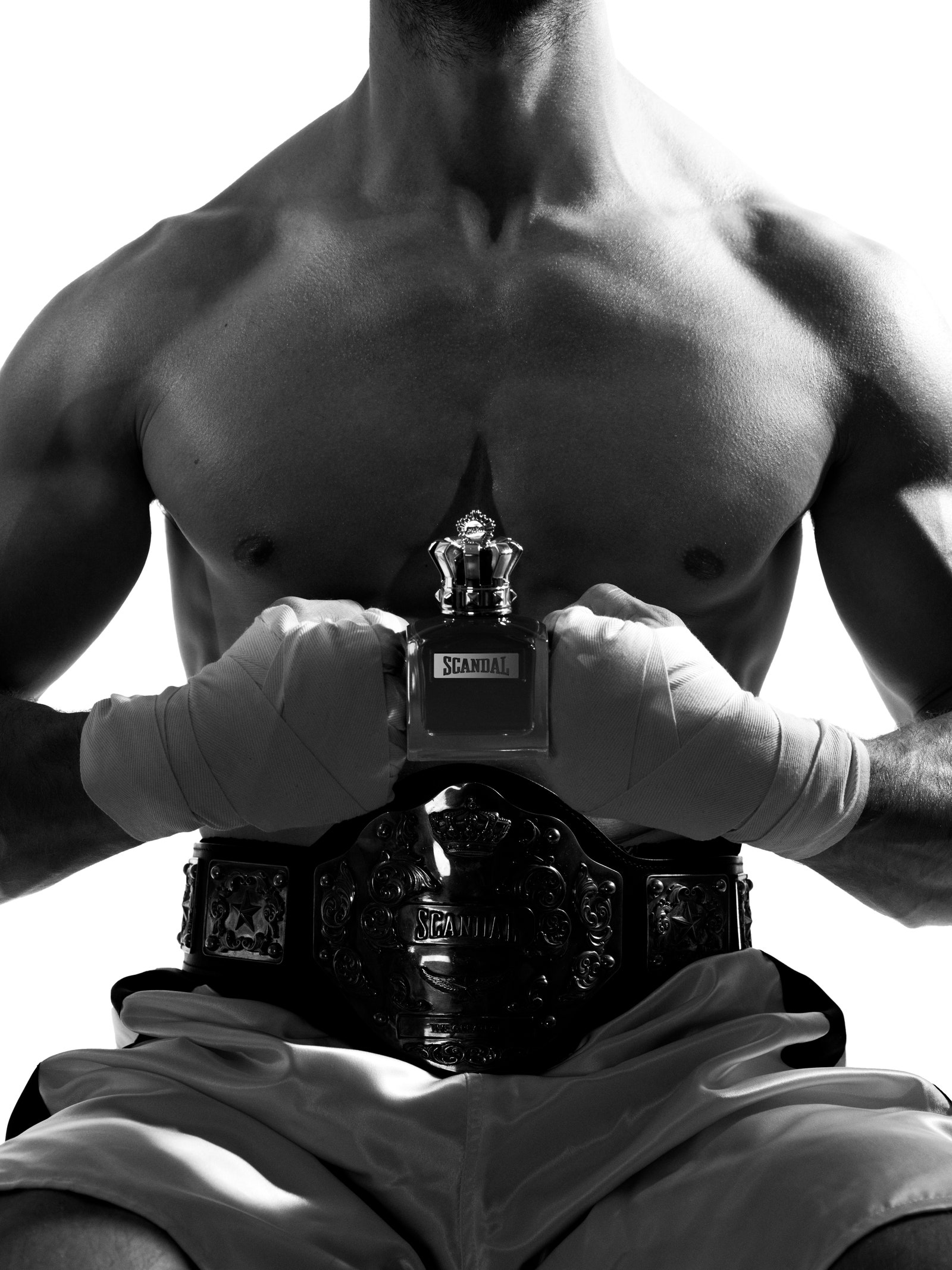 După parfumul Scandal promovat de Irina Shayk, Jean Paul Gaultier lansează un parfum pentru bărbați. O reclamă promovează acest nou parfum masculin. Anunțul Jean Paul Gaultier pentru Scandal Homme este foarte scurt: 15 secunde. Descoperim un tânăr fără cămașă, cu o coroană roșie pe cap, și o tânără femeie într-o rochie neagră fără bretele, tăiată și strânsă, absolut scandaloasă. Spre uralele mulțimii, cele două modele se regăsesc în ring. După o scurtă luptă, urmează un moment de seducție intensă care are loc între ei.