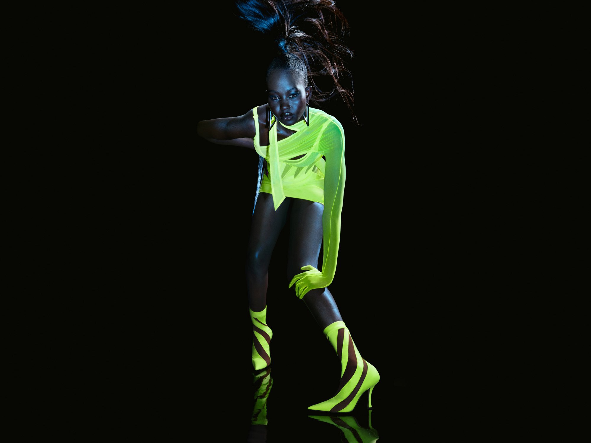 Acea moștenire reimaginată a lui Mugler a atras-o pe Choi. Botine elastice, tocuri de 10 cm împodobite cu cristale, pantofi galbeni neon, inserții din plasă și bile strălucitoare sunt câteva dintre elementele pantofilor, despre care Cadwallader spune că emană „un anumit sentiment de glamour și încredere împuternicită”, la fel ca și hainele mărcii sale.