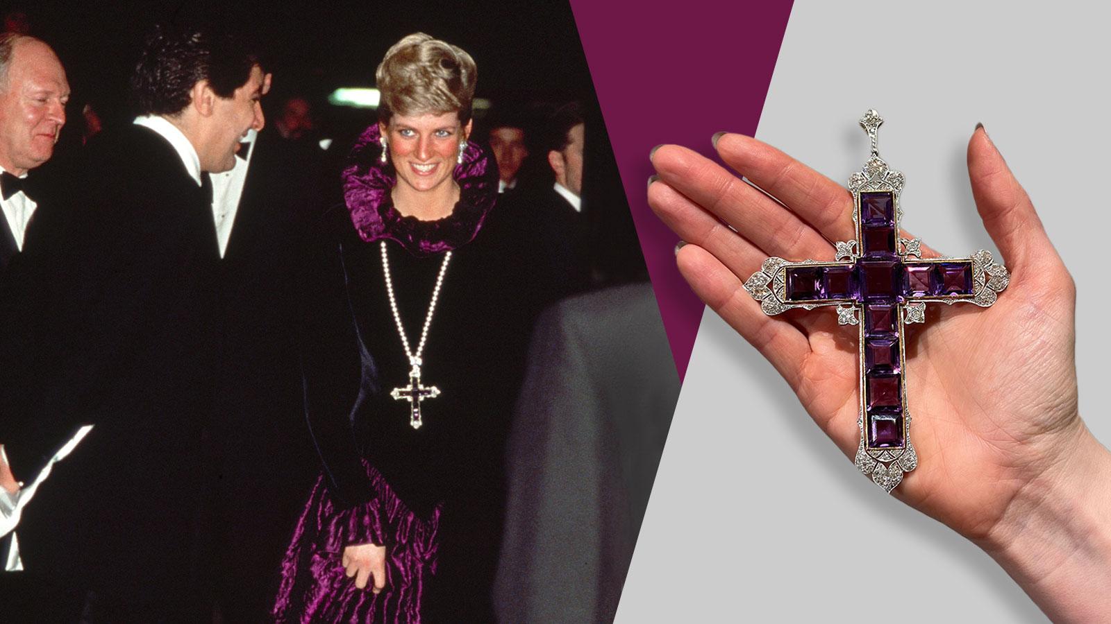 Prințesa Diana „avea o pasiune deosebită” pentru pandantiv, a spus casa de licitații, și l-a prezentat în mod celebru în timp ce purta o rochie neagră și violetă Catherine Walker la o gală de caritate în sprijinul Birthright, o organizație caritabilă care lucrează pentru a proteja drepturile omului în timpul sarcinii și a nașterii, în octombrie 1987.