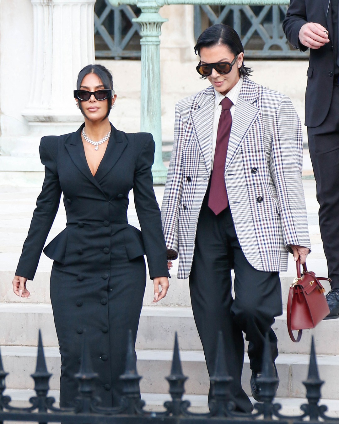 Kris Jenner a purtat un sacou supradimensionat în carouri negre, albe și roșii, semnat Bottega Veneta (purtat cândva de fiica ei, Kendall Jenner), pe care l-a asortat cu o cămașă albă impecabilă, pantaloni negri și o cravată vișinie. Și-a completat ținuta cu pantofi negri, o geantă vișinie și ochelari de soare aviator închiși la culoare.