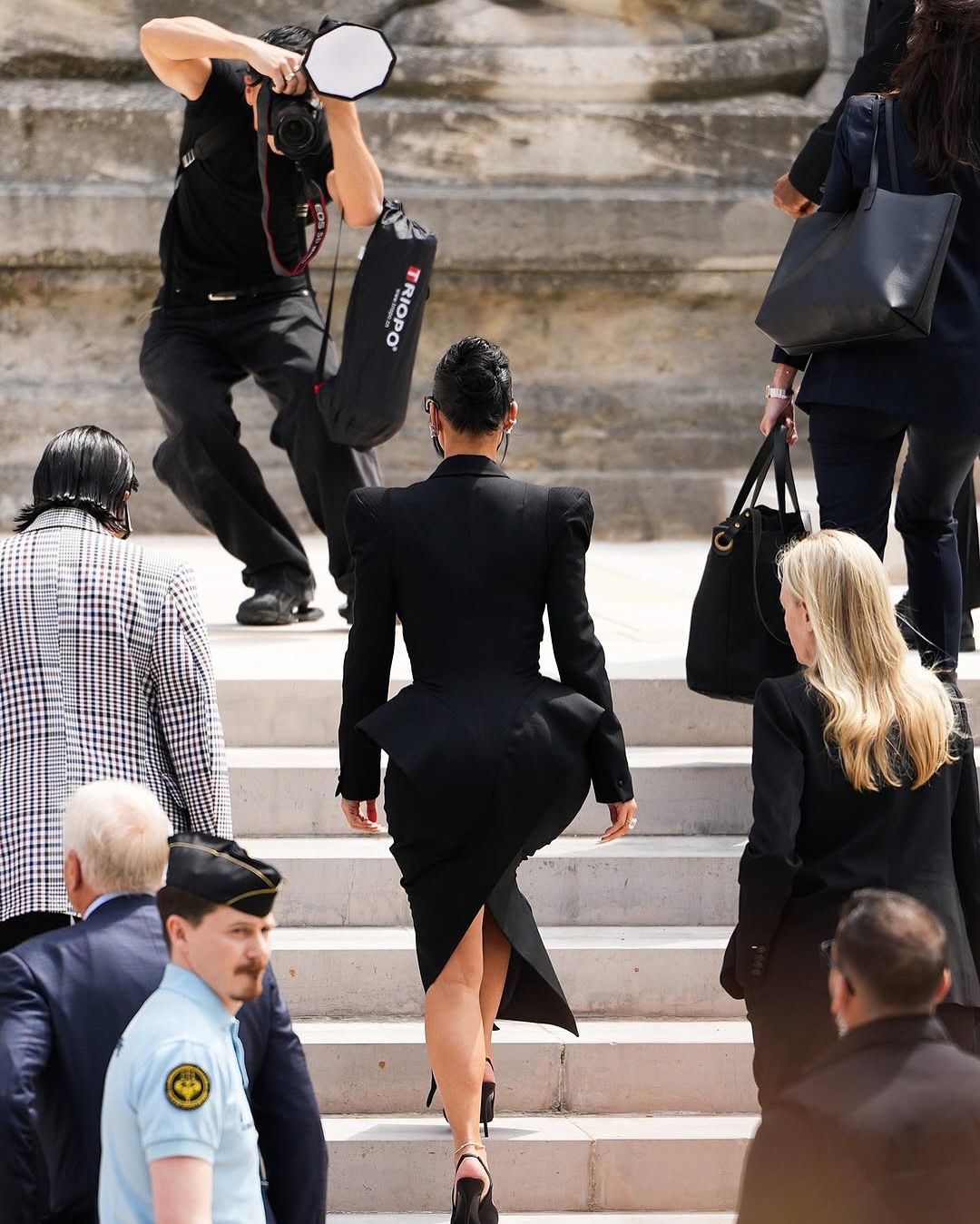 Kardashian a purtat rochia neagră cu pantofi cu toc ascuțit negri, tip slingback, de la Saint Laurent, ochelari de soare cat eye negri și un colier cu diamante strălucitor de la Samer Halimeh New York, cu cercei cu diamante asortați (inclusiv un cercei Briony Raymond de 8.100 de dolari), inele și o brățară de gleznă - pentru a le arăta hoților ce pierd. Bijuteriile s-au ridicat la suma de 7 milioane de dolari, conform Page Six.
